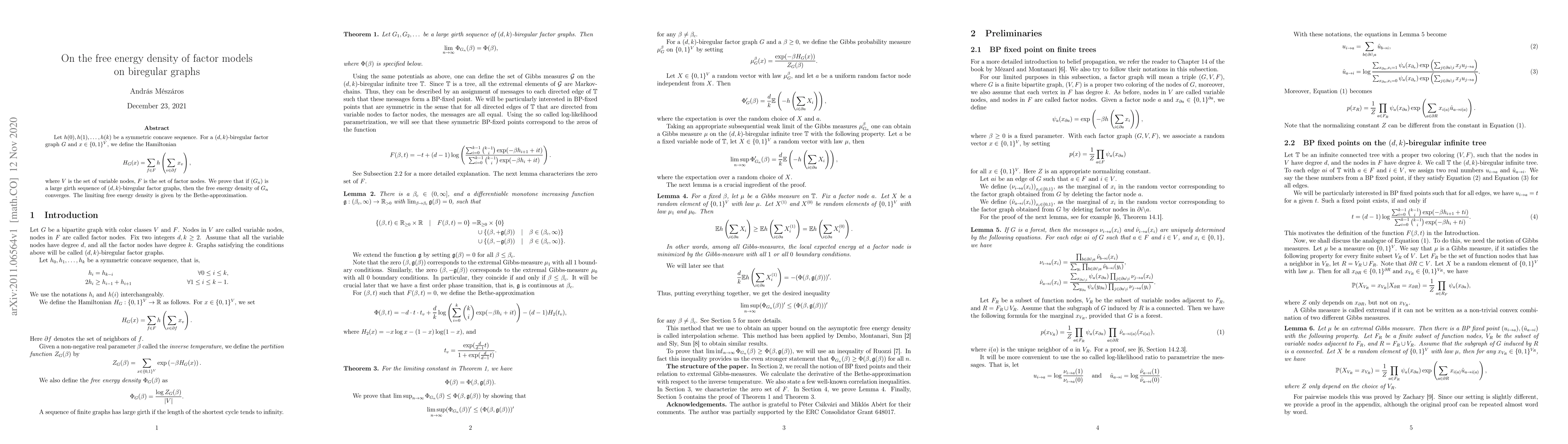 Let $h(0),h(1),\dots,h(k)$ be a symmetric concave sequence. For a $(d,k)$-biregular factor graph $G$ and $x\in \{0,1\}^V$, we define the Hamiltonian \[H_G(x)=\sum_{f\in F} h\left(\sum_{v\in \partial f} x_v\right),\] where $V$ is the set of variable nodes, $F$ is the set of factor nodes. We prove that if $(G_n)$ is a large girth sequence of $(d,k)$-biregular factor graphs, then the free energy density of $G_n$ converges. The limiting free energy density is given by the Bethe-approximation.
