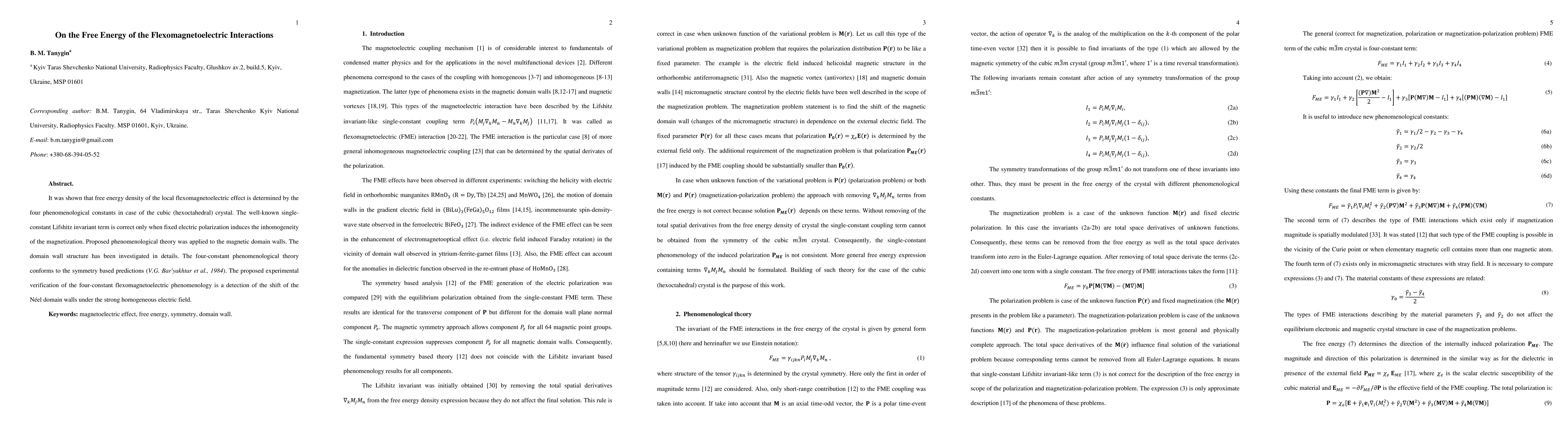 It was shown that free energy density of the local flexomagnetoelectric effect is determined by the four phenomenological constants in case of the cubic (hexoctahedral) crystal. The well-known single-constant Lifshitz invariant term is correct only when fixed electric polarization induces the inhomogeneity of the magnetization. Proposed phenomenological theory was applied to the magnetic domain walls. The domain wall structure has been investigated in details. The four-constant phenomenological theory conforms to the symmetry based predictions (V.G. Bar'yakhtar et al., 1984). The proposed experimental verification of the four-constant flexomagnetoelectric phenomenology is a detection of the shift of the N\'eel domain walls under the strong homogeneous electric field.