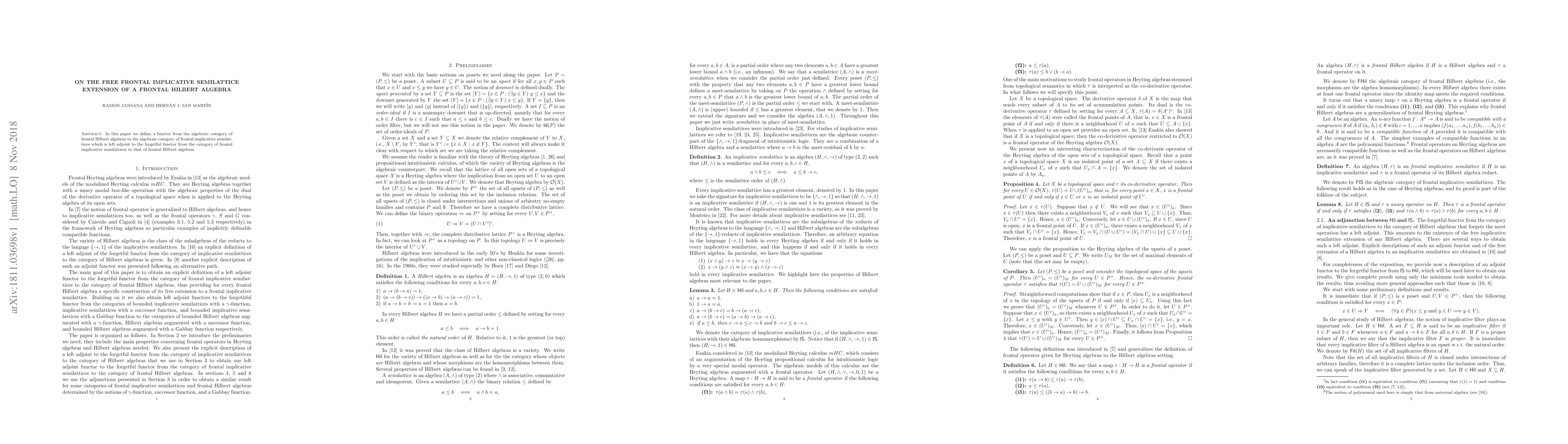 Summary: The paper introduces a left adjoint functor from frontal Hilbert algebras to frontal implicative semilattices, establishing a connection between these two algebraic structures. This functor extends the concept of frontal Hilbert algebras to frontal implicative semilattices.