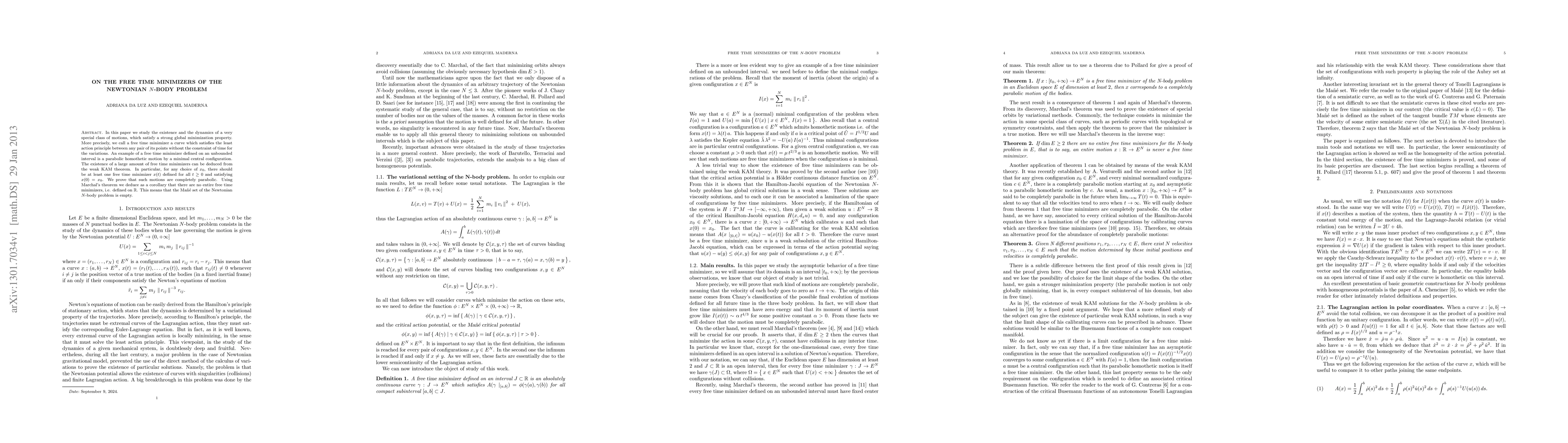 In this paper we study the existence and the dynamics of a very special class of motions, which satisfy a strong global minimization property. More precisely, we call a free time minimizer a curve which satisfies the least action principle between any pair of its points without the constraint of time for the variations. An example of a free time minimizer defined on an unbounded interval is a parabolic homothetic motion by a minimal central confguration. The existence of a large amount of free time minimizers can be deduced from the weak KAM theorem. In particular, for any choice of x0, there should be at least one free time minimizer x(t) defined for all positive time and satisfying x(0)=x0. We prove that such motions are completely parabolic. Using Marchal's theorem we deduce as a corollary that there are no entire free time minimizers, i.e. defined on R. This means that the Ma\~n\'e set of the Newtonian N-body problem is empty.