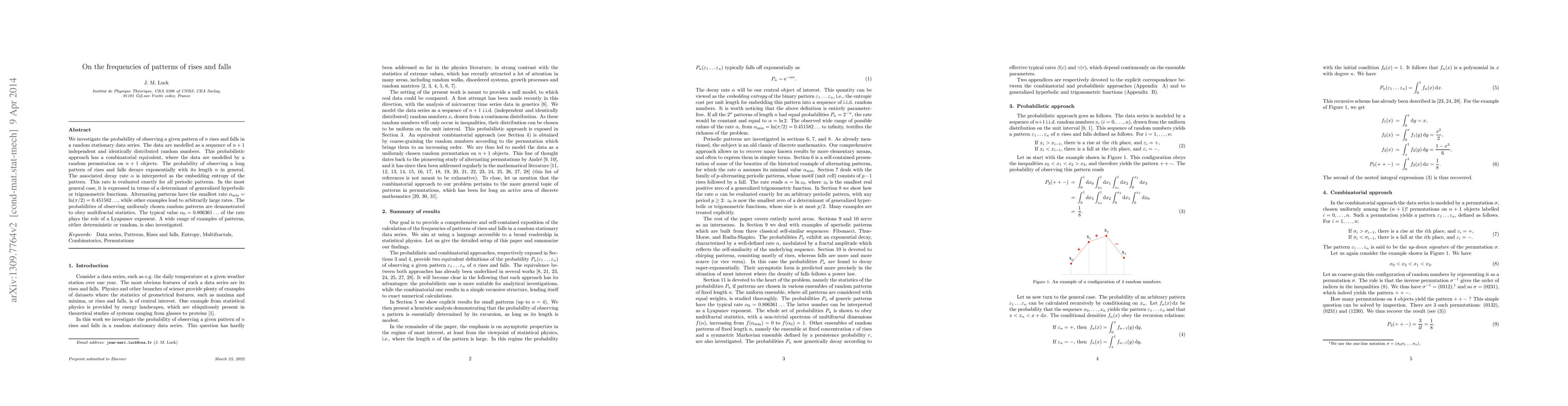 This paper investigates the probability of observing specific patterns of rises and falls in random stationary data series, modeled as independent random numbers or permutations. The decay rate of these patterns' probabilities is shown to be an embedding entropy, with alternating patterns having the smallest rate and random patterns following multifractal statistics.