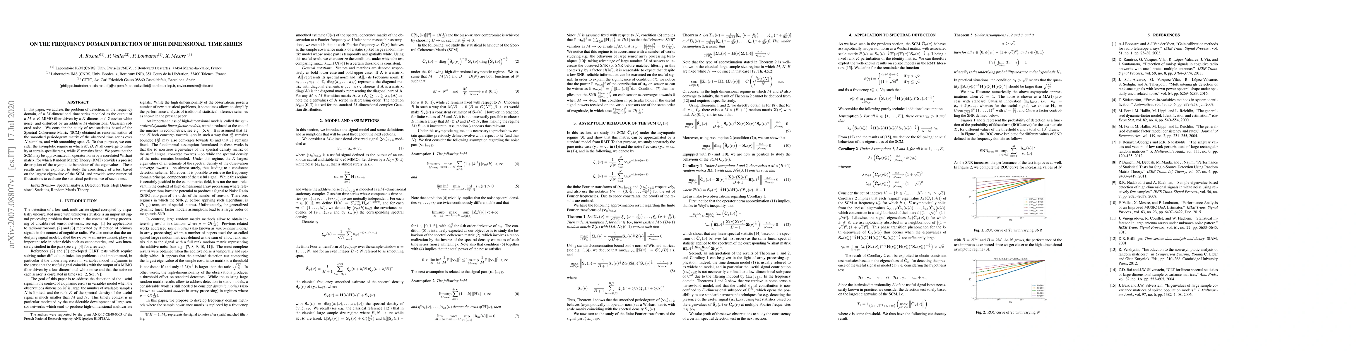 This paper investigates the detection of M-dimensional time series in the frequency domain using the Spectral Coherence Matrix (SCM) and Random Matrix Theory (RMT). It demonstrates that the SCM can be approximated by a correlated Wishart matrix, providing insights into the asymptotic behavior of its eigenvalues and the consistency of a test based on the largest eigenvalue.