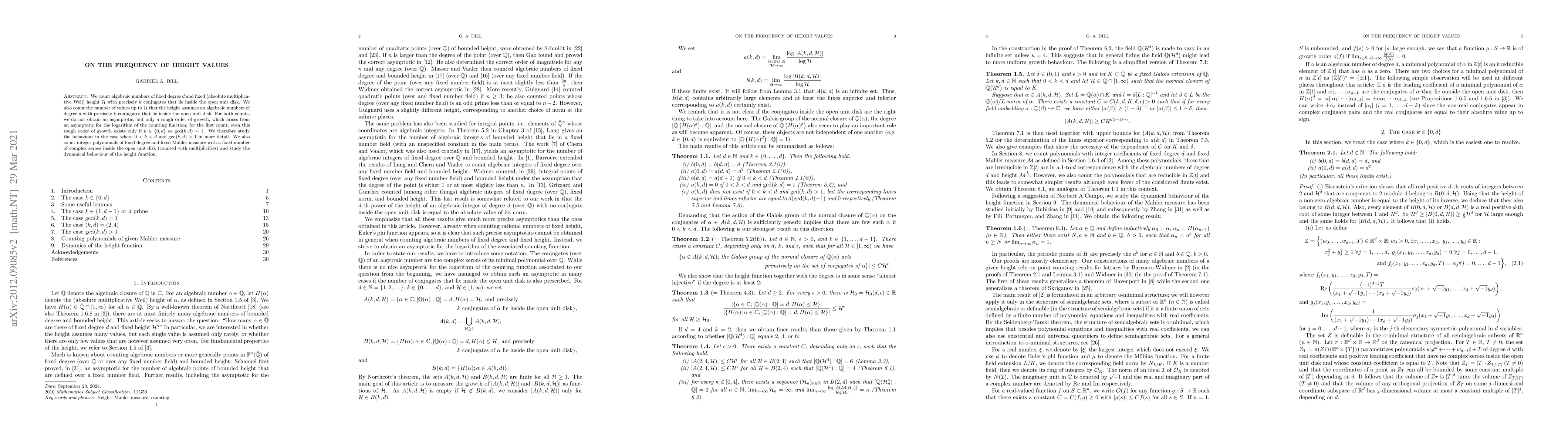 This paper studies the frequency of height values for algebraic numbers with a fixed degree and number of conjugates inside the open unit disk. It also explores the behavior of the Mahler measure and dynamical properties of the height function for integer polynomials.