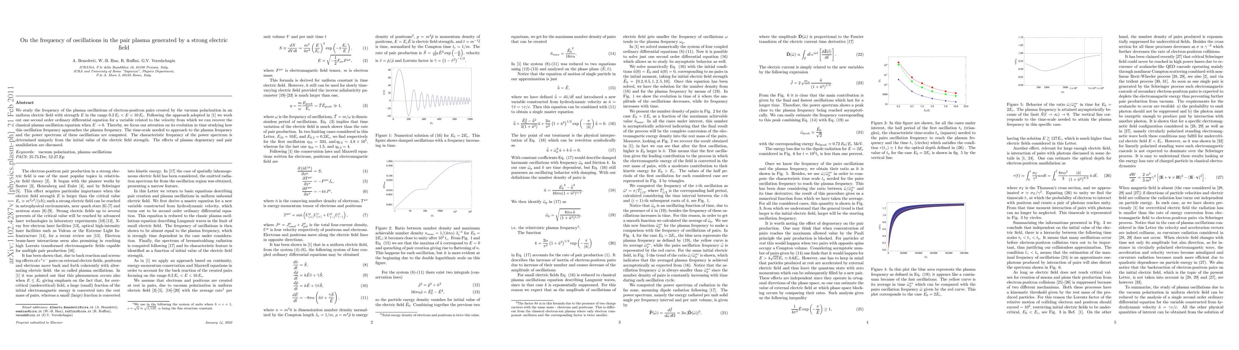 We study the frequency of the plasma oscillations of electron-positron pairs created by the vacuum polarization in an uniform electric field with strength E in the range 0.2 Ec < E < 10 Ec. Following the approach adopted in [1] we work out one second order ordinary differential equation for a variable related to the velocity from which we can recover the classical plasma oscillation equation when E -> 0. Thereby, we focus our attention on its evolution in time studying how this oscillation frequency approaches the plasma frequency. The time-scale needed to approach to the plasma frequency and the power spectrum of these oscillations are computed. The characteristic frequency of the power spectrum is determined uniquely from the initial value of the electric field strength. The effects of plasma degeneracy and pair annihilation are discussed.