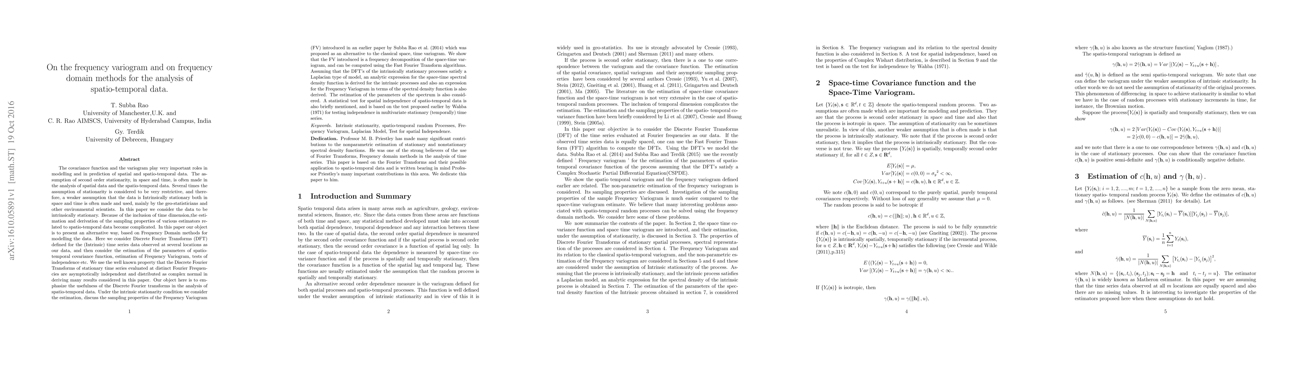 This paper proposes frequency domain methods, specifically using Discrete Fourier Transforms, for modeling and analyzing spatio-temporal data that are intrinsically stationary. It aims to simplify the estimation of spatio-temporal covariance functions and the frequency variogram, leveraging the asymptotic independence of Fourier transforms.