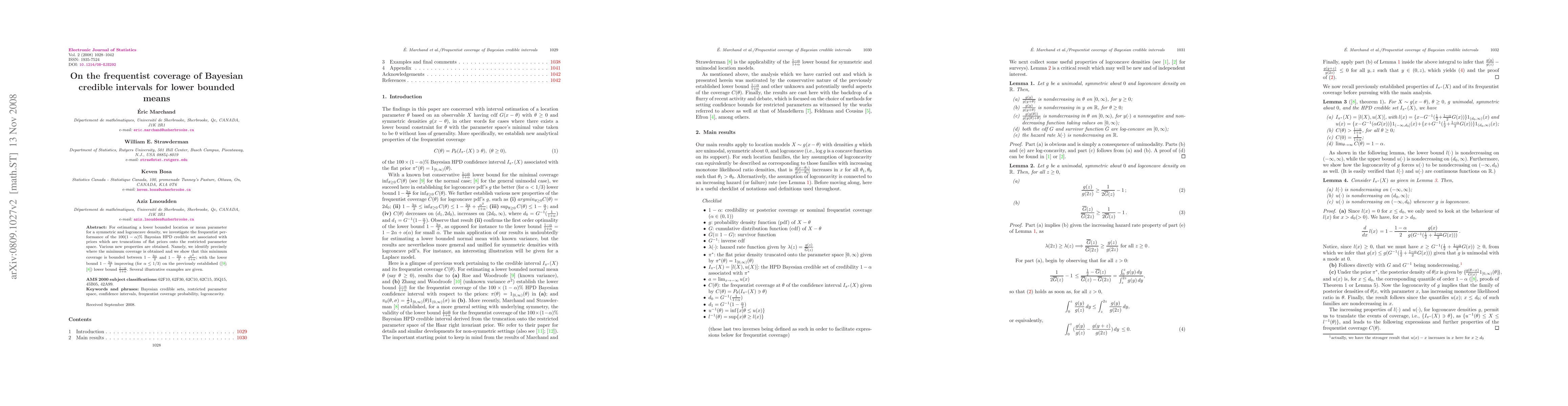 This paper examines the frequentist coverage of Bayesian credible intervals for lower-bounded means, finding that the minimum coverage is between $1-rac{3alpha}{2}$ and $1-rac{3alpha}{2}+rac{alpha^2}{1+alpha}$, improving on previous bounds. It provides new properties and examples to illustrate these findings.