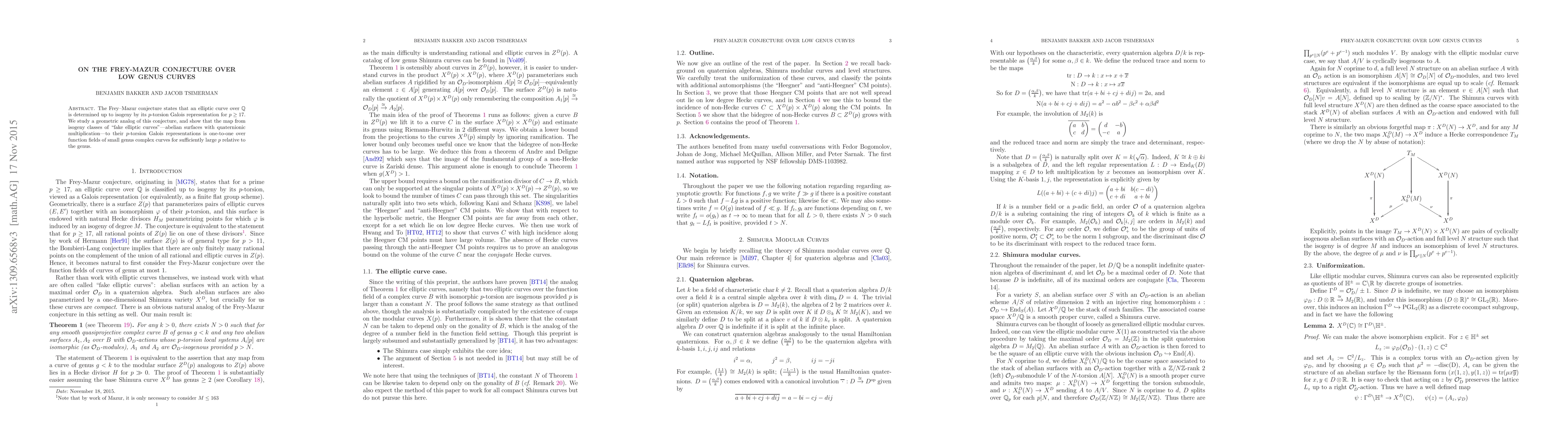 The Frey--Mazur conjecture states that an elliptic curve over $\mathbb{Q}$ is determined up to isogeny by its $p$-torsion Galois representation for $p\geq 17$. We study a geometric analog of this conjecture, and show that the map from isogeny classes of "fake elliptic curves"---abelian surfaces with quaternionic multiplication---to their $p$-torsion Galois representations is one-to-one over function fields of small genus complex curves for sufficiently large $p$ relative to the genus.