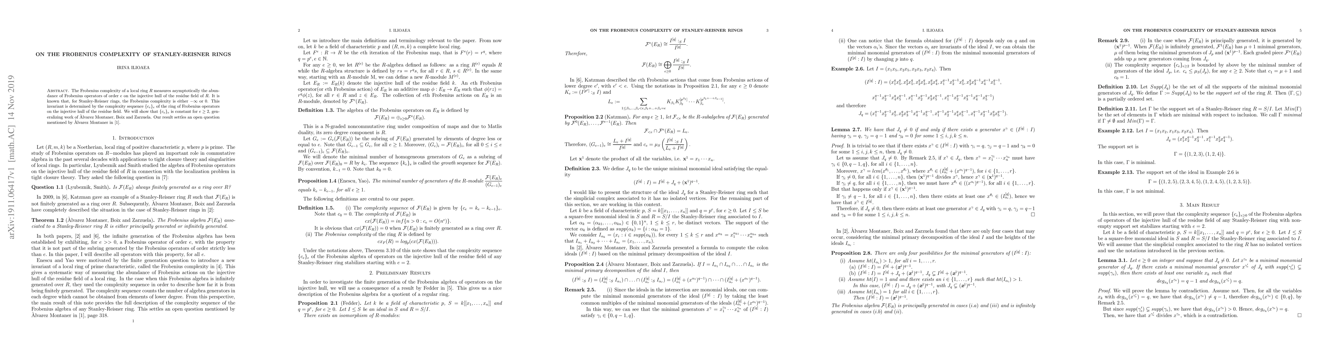 The Frobenius complexity of a local ring $R$ measures asymptotically the abundance of Frobenius operators of order $e$ on the injective hull of the residue field of $R$. It is known that, for Stanley-Reisner rings, the Frobenius complexity is either $-\infty$ or $0$. This invariant is determined by the complexity sequence $\{c_ e\}_e $ of the ring of Frobenius operators on the injective hull of the residue field. We will show that $\{c_ e\}_e $ is constant for $e\geq 2,$ generalizing work of Alvarez Montaner, Boix and Zarzuela. Our result settles an open question mentioned by Alvarez Montaner in one of his papers.