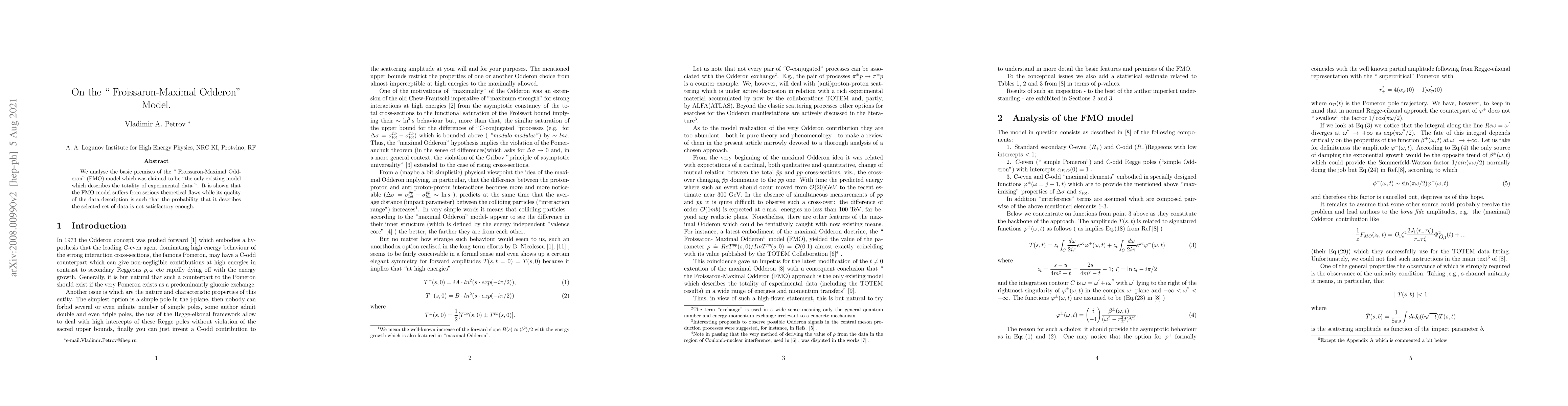 We analyse the basic premises of the `` Froissaron-Maximal Odderon" (FMO) model which was claimed to be ``the only existing model which describes the totality of experimental data ". It is shown that the FMO model suffers from serious theoretical flaws while its quality of the data description is such that the probability that it describes the selected set of data is not satisfactory enough.