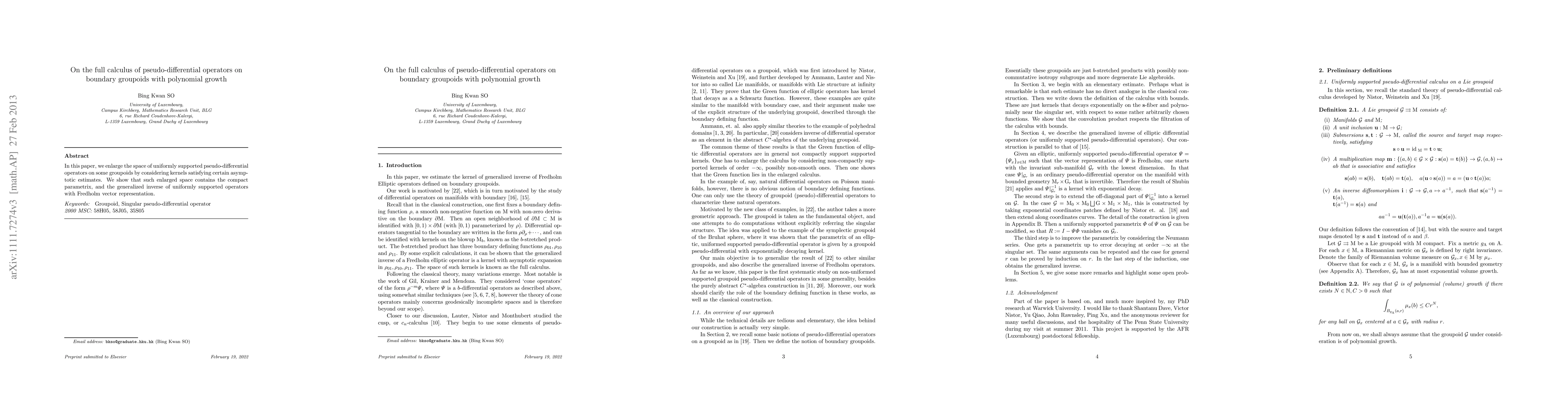 This paper expands the scope of pseudo-differential operators on boundary groupoids by incorporating kernels with specific asymptotic properties. It demonstrates that this extended space includes the compact parametrix and the generalized inverse for uniformly supported operators with Fredholm vector representation.