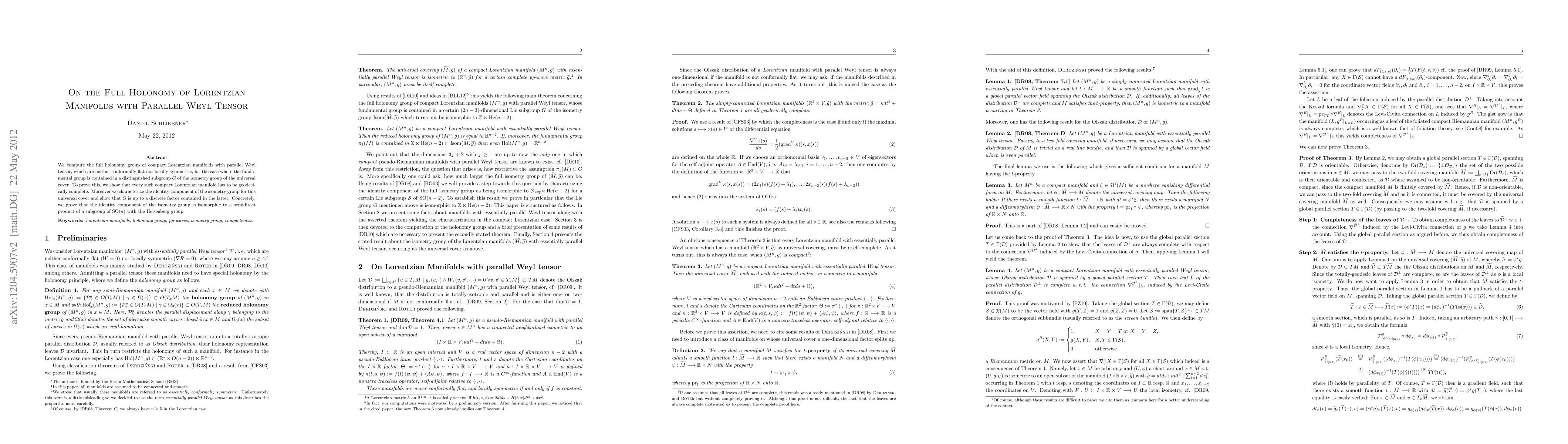 The research computes the full holonomy group of compact Lorentzian manifolds with a parallel Weyl tensor, under specific conditions on the fundamental group and its relationship with a distinguished subgroup G of the isometry group of the universal cover.