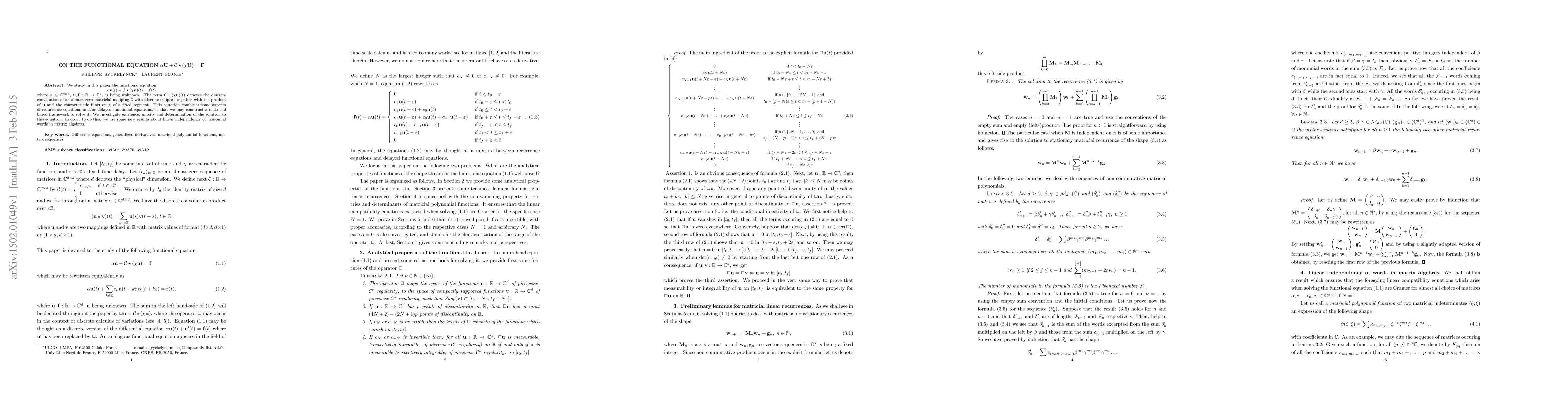 We study in this paper the functional equation $\displaystyle \alpha \mathbf{u}(t)+\mathcal{C}\star(\chi \mathbf{u})(t)=\mathbf{f}(t)$ where $\alpha\in\mathbb{C}^{d\times d}$, $\mathbf{u},\mathbf{f}:\mathbb{R}\rightarrow\mathbb{C}^d$, $\mathbf{u}$ being unknown. The term $\mathcal{C}\star(\chi \mathbf{u})(t)$ denotes the discrete convolution of an almost zero matricial mapping $\mathcal{C}$ with discrete support together with the product of $\mathbf{u}$ and the characteristic function $\chi$ of a fixed segment. This equation combines some aspects of recurrence equations and/or delayed functional equations, so that we may construct a matricial based framework to solve it. We investigate existence, unicity and determination of the solution to this equation. In order to do this, we use some new results about linear independency of monomial words in matrix algebras.