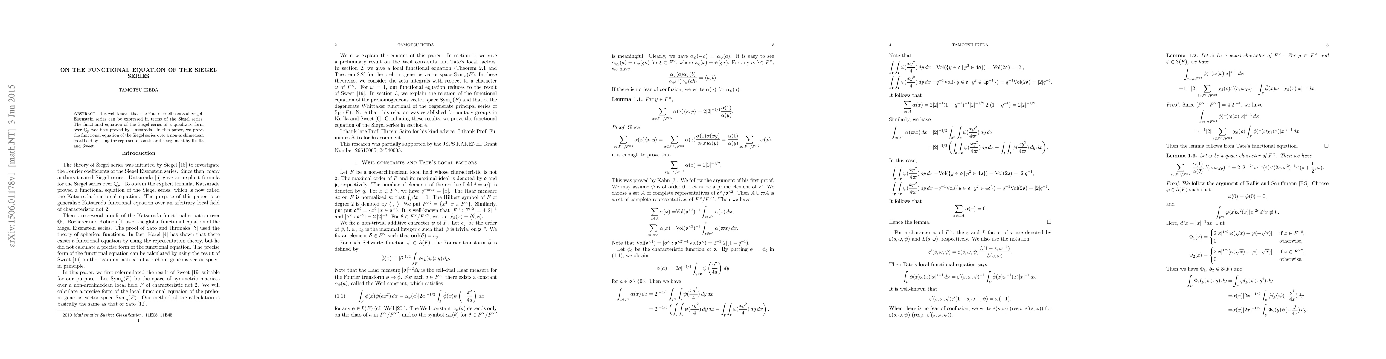 This paper proves the functional equation of the Siegel series over non-archimedean local fields using representation theoretic methods developed by Kudla and Sweet, extending Katsurada's earlier work on quadratic forms over $\mathbb{Q}_p$.