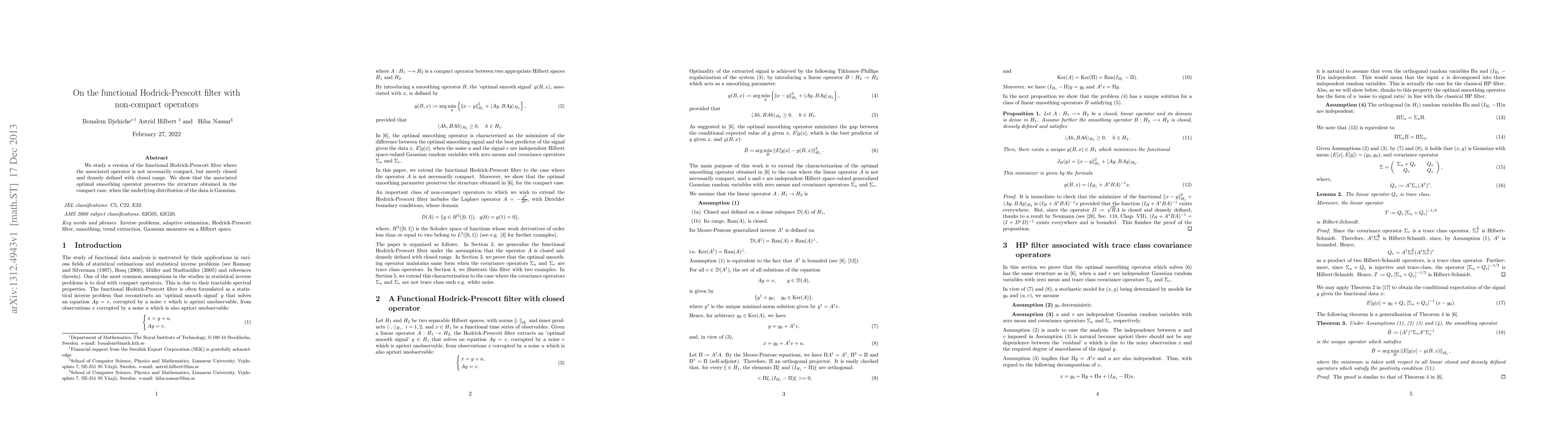 We study a version of the functional Hodrick-Prescott filter where the associated operator is not necessarily compact, but merely closed and densely defined with closed range. We show that the associated optimal smoothing operator preserves the structure obtained in the compact case, when the underlying distribution of the data is Gaussian.