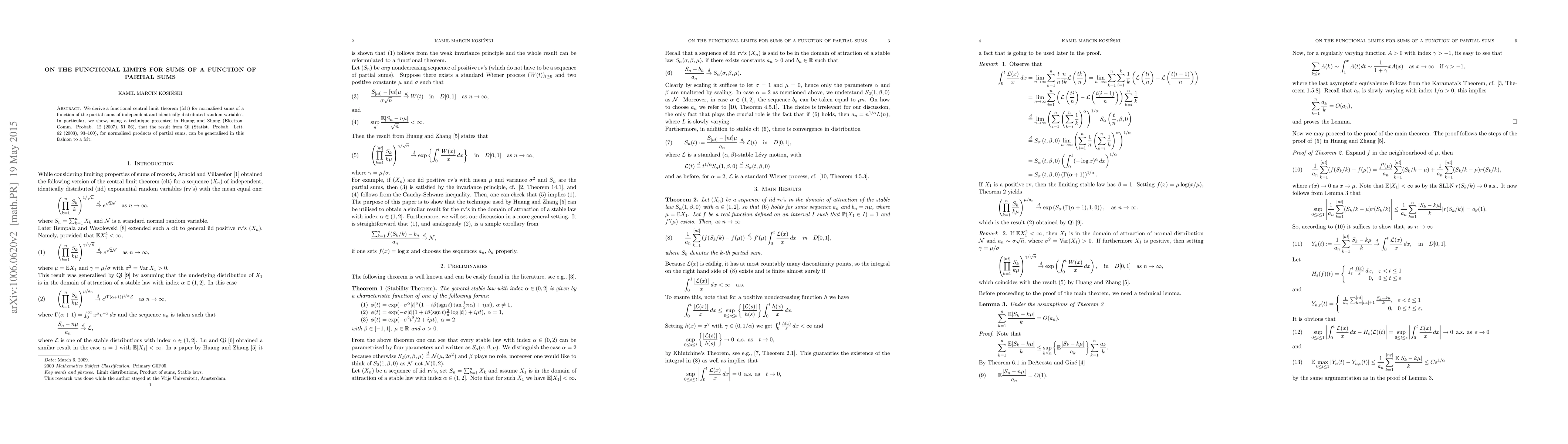 This paper derives a functional central limit theorem for normalized sums of a function applied to the partial sums of independent and identically distributed random variables, generalizing a previous result for normalized products of partial sums using a technique from Huang and Zhang.