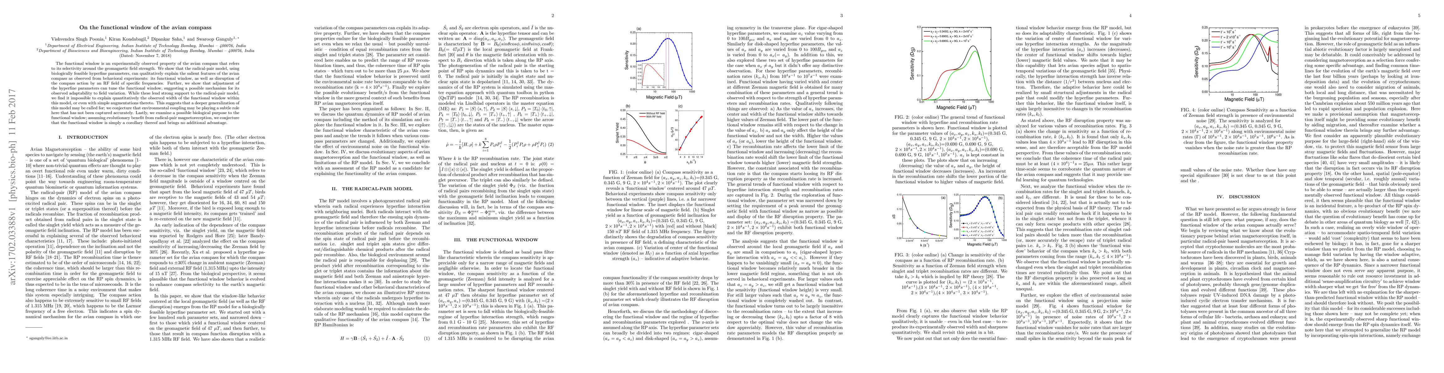 The functional window is an experimentally observed property of the avian compass that refers to its selectivity around the geomagnetic field strength. We show that the radical-pair model, using biologically feasible hyperfine parameters, can qualitatively explain the salient features of the avian compass as observed from behavioral experiments: its functional window, as well as disruption of the compass action by an RF field of specific frequencies. Further, we show that adjustment of the hyperfine parameters can tune the functional window, suggesting a possible mechanism for its observed adaptability to field variation. While these lend strong support to the radical-pair model, we find it impossible to explain quantitatively the observed width of the functional window within this model, or even with simple augmentations thereto. This suggests that a deeper generalization of this model may be called for; we conjecture that environmental coupling may be playing a subtle role here that has not been captured accurately. Lastly, we examine a possible biological purpose to the functional window; assuming evolutionary benefit from radical-pair magnetoreception, we conjecture that the functional window is simply a corollary thereof and brings no additional advantage.