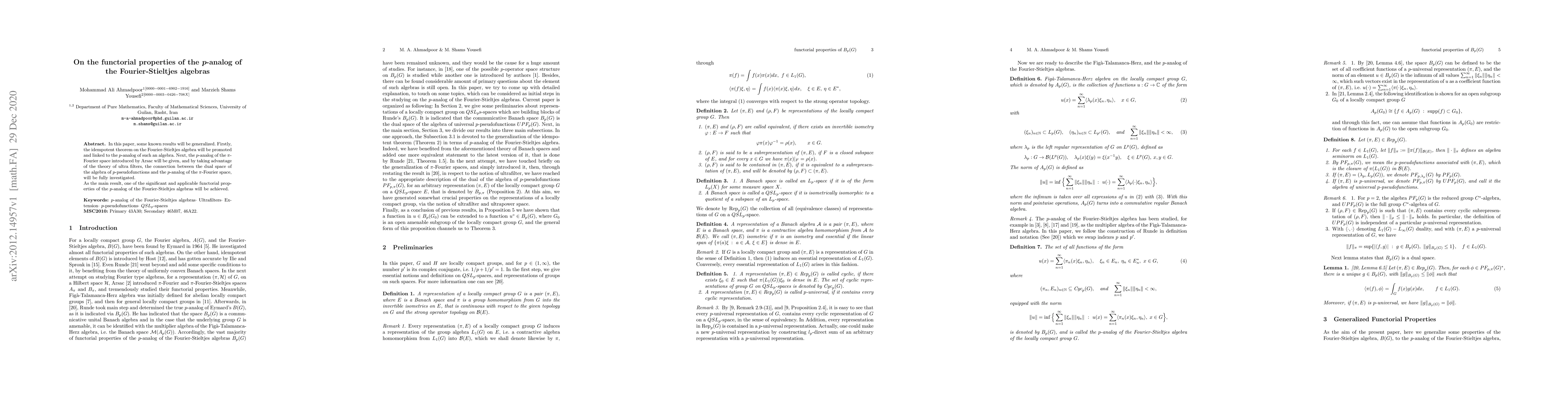 In this paper, some known results will be generalized. Firstly, the idempotent theorem on the Fourier-Stieltjes algebra will be promoted and linked to the $p$-analog of such an algebra. Next, the $p$-analog of the $\pi$-Fourier space introduced by Arsac will be given, and by taking advantage of the theory of ultra filters, the connection between the dual space of the algebra of $p$-pseudofunctions and the $p$-analog of the $\pi$-Fourier space, will be fully investigated. As the main result, one of the significant and applicable functorial properties of the $p$-analog of the Fourier-Stieltjes algebras will be achieved.