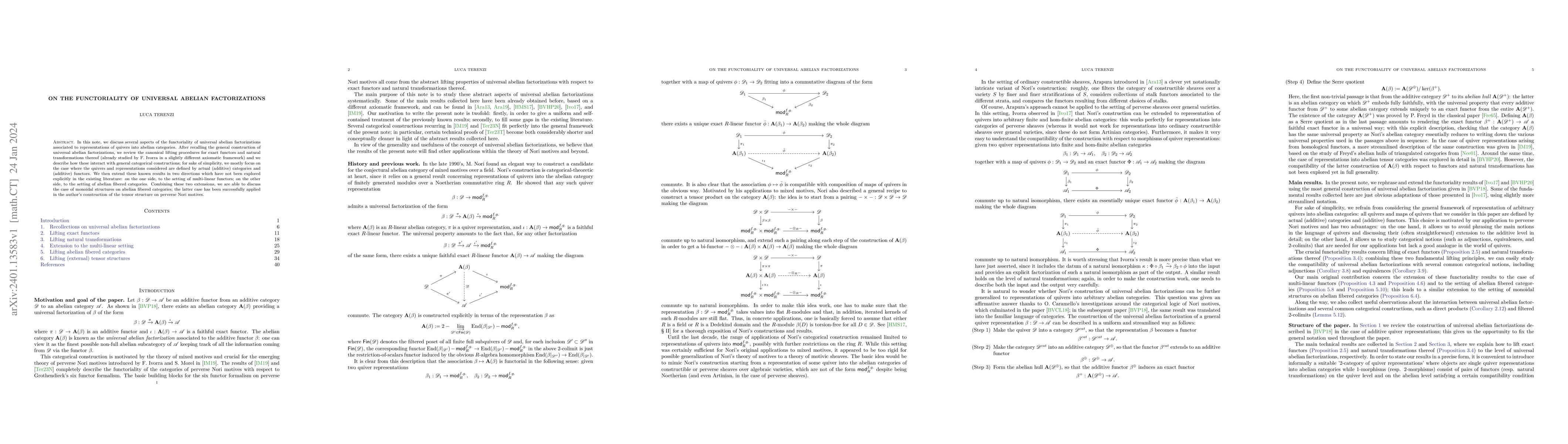 In this note, we discuss several aspects of the functoriality of universal abelian factorizations associated to representations of quivers into abelian categories. After recalling the general construction of universal abelian factorizations, we review the canonical lifting procedures for exact functors and natural transformations thereof (already studied by F. Ivorra in a slightly different axiomatic framework) and we describe how these interact with general categorical constructions; for sake of simplicity, we mostly focus on the case where the quivers and representations considered are defined by actual (additive) categories and (additive) functors. We then extend these known results in two directions which have not been explored explicitly in the existing literature: on the one side, to the setting of multi-linear functors; on the other side, to the setting of abelian fibered categories. Combining these two extensions, we are able to discuss the case of monoidal structures on abelian fibered categories; the latter case has been successfully applied in the author's construction of the tensor structure on perverse Nori motives.