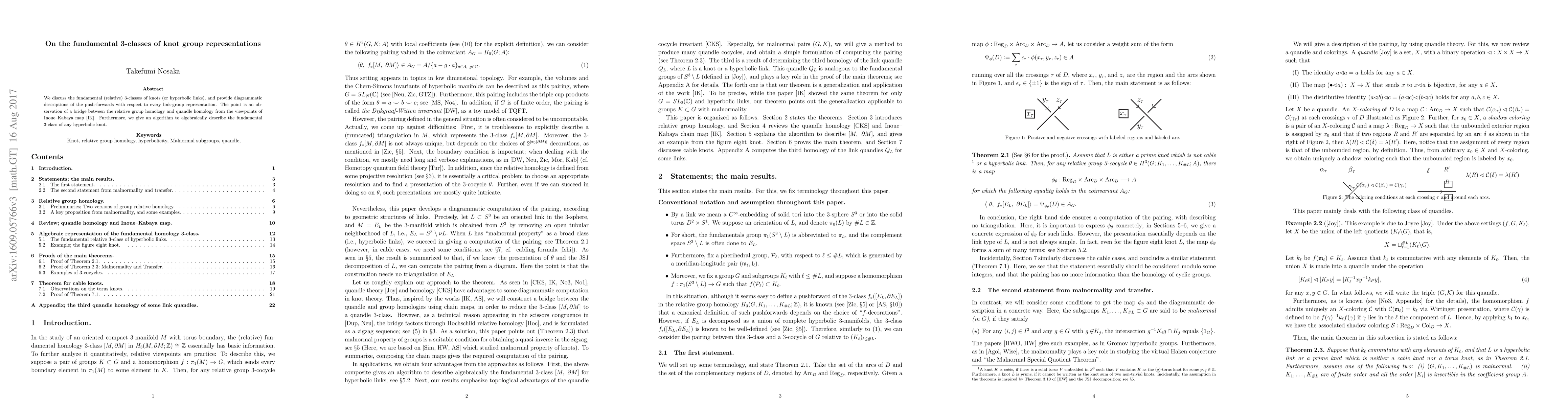 This paper explores the fundamental 3-classes of knot groups, presenting diagrammatic descriptions for link-group representations. It highlights a connection between relative group homology and quandle homology, introducing an algorithm to algebraically describe the fundamental 3-class of any hyperbolic knot.