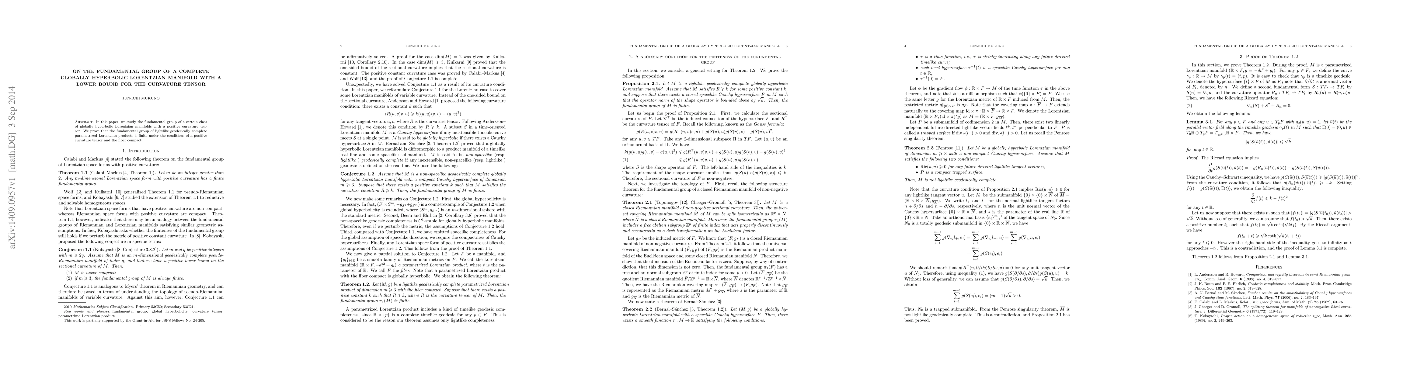 Summary: This paper investigates the fundamental group of globally hyperbolic Lorentzian manifolds with a positive curvature tensor, proving that the group is finite when the manifold is lightlike geodesically complete and the fiber is compact.