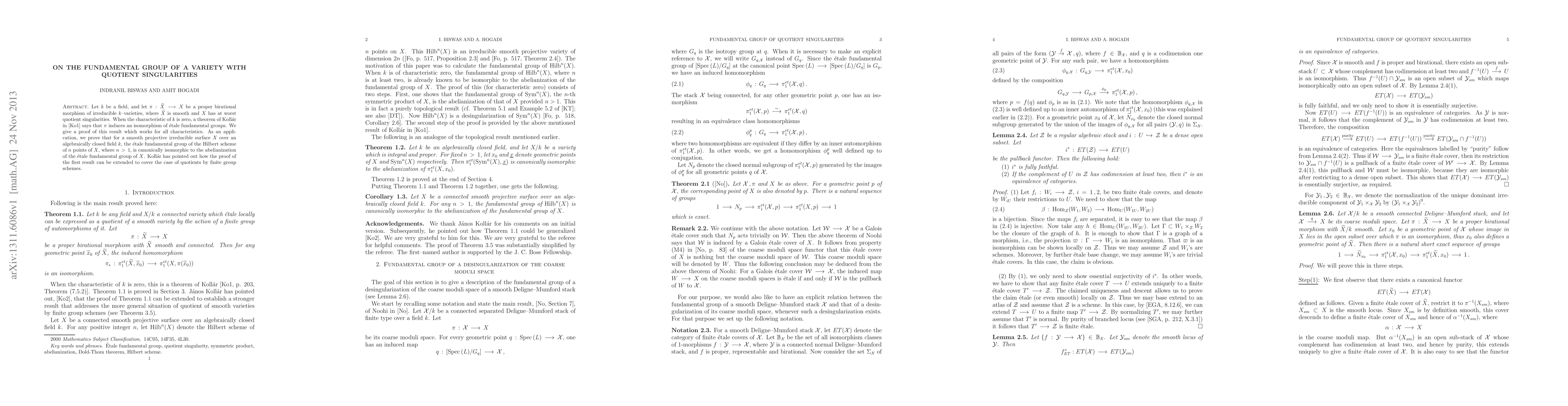 Let k be a field, and let {\pi}:\tilde{X} -> X be a proper birational morphism of irreducible k-varieties, where \tilde{X} is smooth and X has at worst quotient singularities. When the characteristic of k is zero, a theorem of Koll\'ar in [Ko1] says that {\pi} induces an isomorphism of etale fundamental groups. We give a proof of this result which works for all characteristics. As an application, we prove that for a smooth projective irreducible surface X over an algebraically closed field k, the etale fundamental group of the Hilbert scheme of n points of X, where n > 1, is canonically isomorphic to the abelianization of the etale fundamental group of X. Koll\'ar has pointed out how the proof of the first result can be extended to cover the case of quotients by finite group schemes.