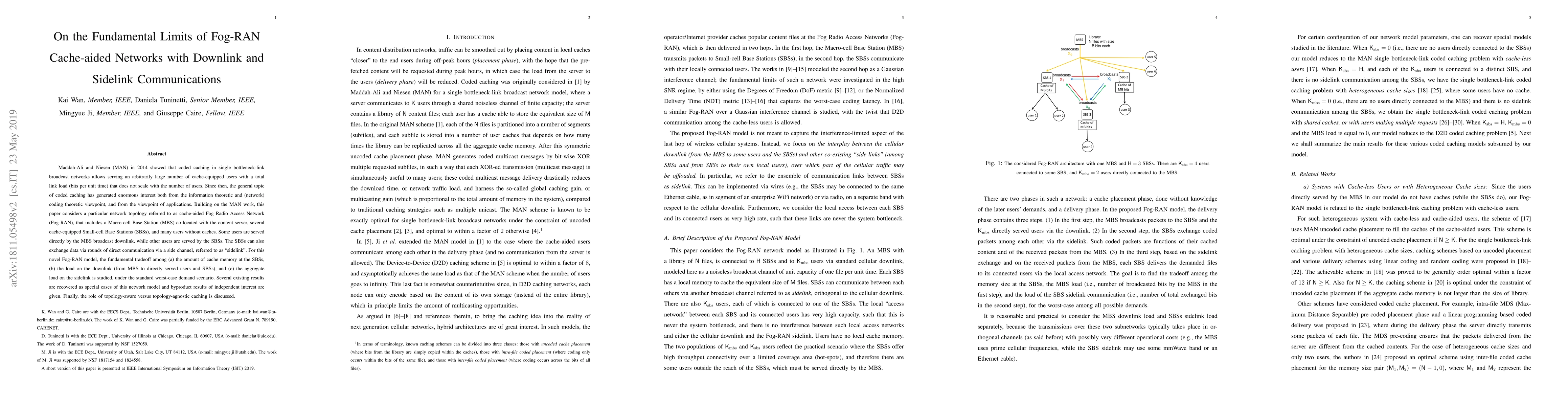 Maddah-Ali and Niesen (MAN) in 2014 showed that coded caching in single bottleneck-link broadcast networks allows serving an arbitrarily large number of cache-equipped users with a total link load (bits per unit time) that does not scale with the number of users. Since then, the general topic of coded caching has generated enormous interest both from the information theoretic and (network) coding theoretic viewpoint, and from the viewpoint of applications. Building on the MAN work, this paper considers a particular network topology referred to as cache-aided Fog Radio Access Network (Fog-RAN), that includes a Macro-cell Base Station (MBS) co-located with the content server, several cache-equipped Small-cell Base Stations (SBSs), and many users without caches. Some users are served directly by the MBS broadcast downlink, while other users are served by the SBSs. The SBSs can also exchange data via rounds of direct communication via a side channel, referred to as "sidelink". For this novel Fog-RAN model, the fundamental tradeoff among (a) the amount of cache memory at the SBSs, (b) the load on the downlink (from MBS to directly served users and SBSs), and (c) the aggregate load on the sidelink is studied, under the standard worst-case demand scenario. Several existing results are recovered as special cases of this network model and byproduct results of independent interest are given. Finally, the role of topology-aware versus topology-agnostic caching is discussed.