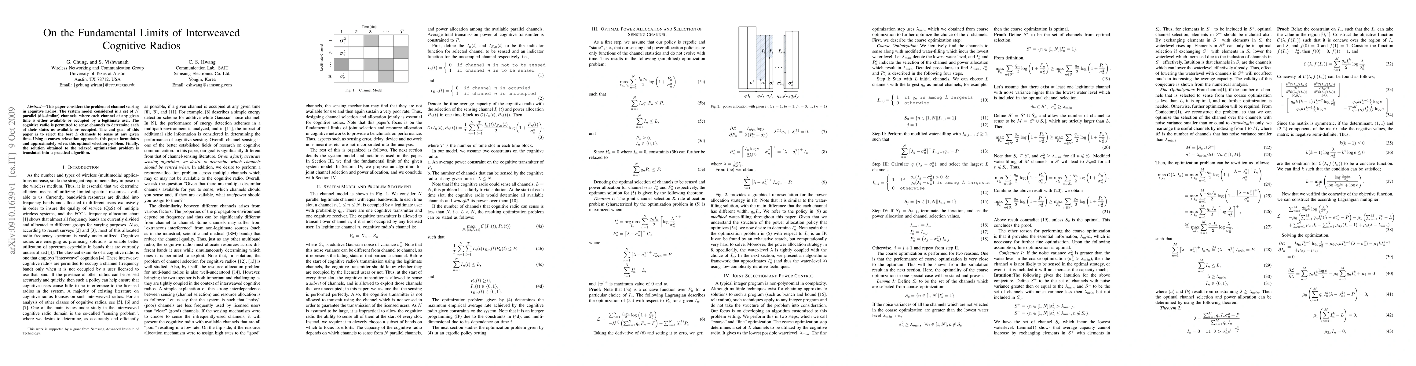 This paper investigates optimal channel selection for cognitive radios in a system with N parallel channels, aiming to determine the best L channels to sense. It employs a convex relaxation approach to solve the selection problem and translates the solution into a practical algorithm.