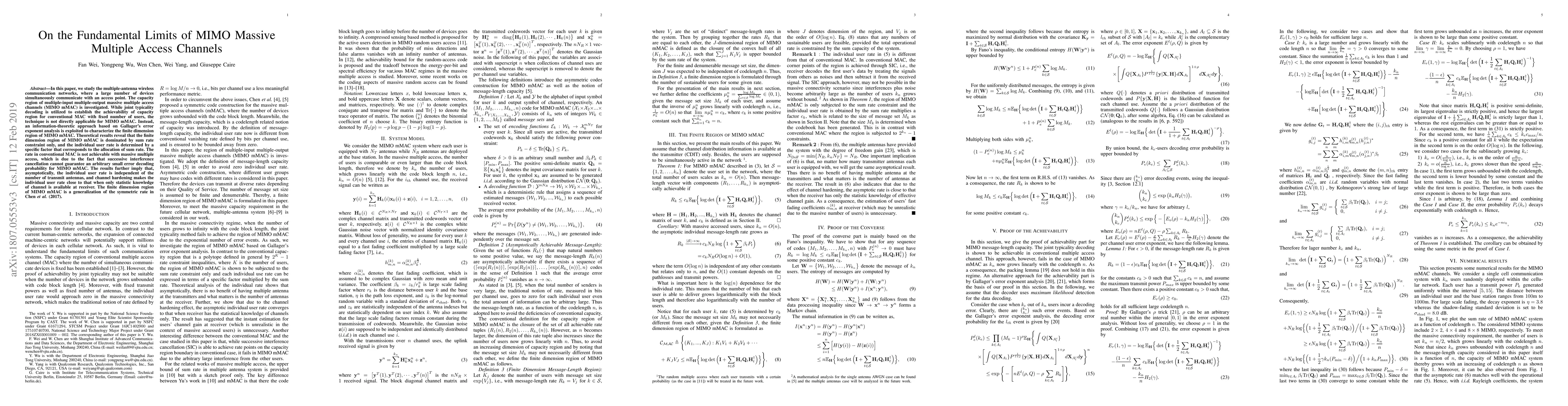 In this paper, we study the multiple-antenna wireless communication networks, where a large number of devices simultaneously communicate with an access point. The capacity region of multiple-input multiple-output massive multiple access channels (MIMO mMAC) is investigated. While joint typicality decoding is utilized to establish the achievability of capacity region for conventional MAC with fixed number of users, the technique is not directly applicable for MIMO mMAC. Instead, an information-theoretic approach based on Gallager's error exponent analysis is exploited to characterize the \textcolor[rgb]{0,0,0}{finite dimension region} of MIMO mMAC. Theoretical results reveal that the finite dimension region of MIMO mMAC is dominated by sum rate constraint only, and the individual user rate is determined by a specific factor that corresponds to the allocation of sum rate. The rate in conventional MAC is not achievable with massive multiple access, which is due to the fact that successive interference cancellation cannot guarantee an arbitrary small error decoding probability for MIMO mMAC. The results further imply that, asymptotically, the individual user rate is independent of the number of transmit antennas, and channel hardening makes the individual user rate close to that when only statistic knowledge of channel is available at receiver. The finite dimension region of MIMO mMAC is a generalization of the symmetric rate in Chen \emph{et al.} (2017).