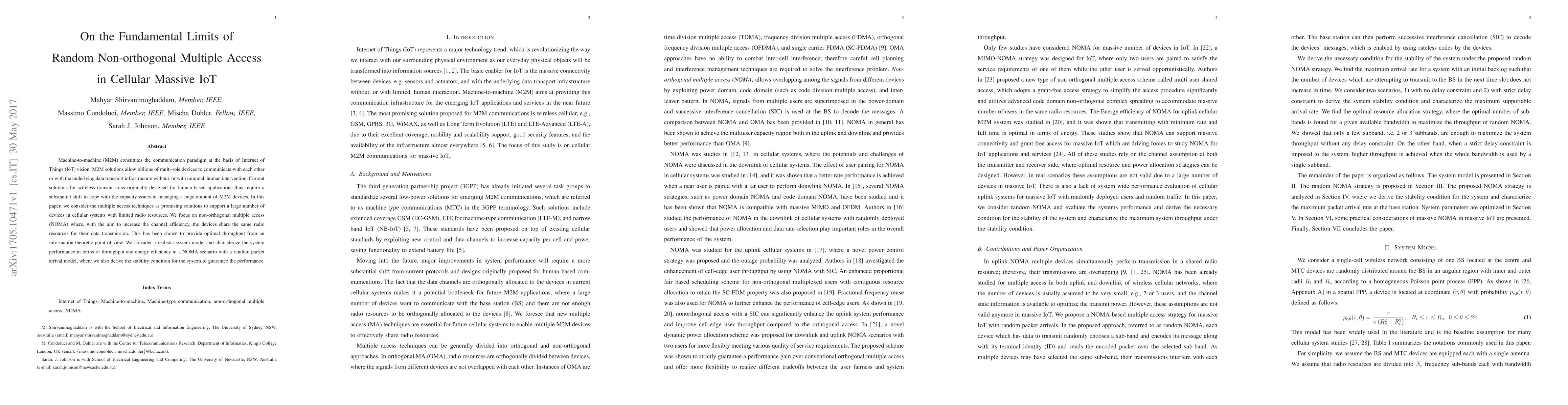 This paper investigates the fundamental limits of random non-orthogonal multiple access (NOMA) in cellular massive IoT systems, aiming to optimize throughput and energy efficiency. It derives performance metrics and stability conditions for NOMA under a realistic system model with random packet arrivals.