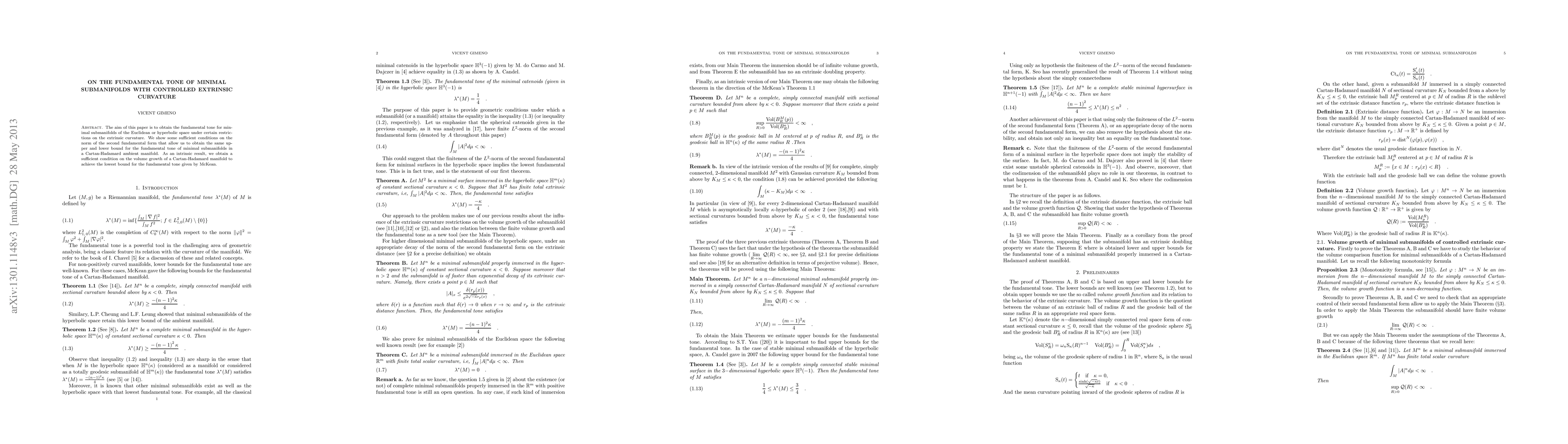 This paper investigates the fundamental tone of minimal submanifolds in Euclidean or hyperbolic spaces under controlled extrinsic curvature, establishing upper and lower bounds for the fundamental tone under certain conditions on the second fundamental form. It also provides a sufficient condition on the volume growth of Cartan-Hadamard manifolds to achieve the lowest bound for the fundamental tone.