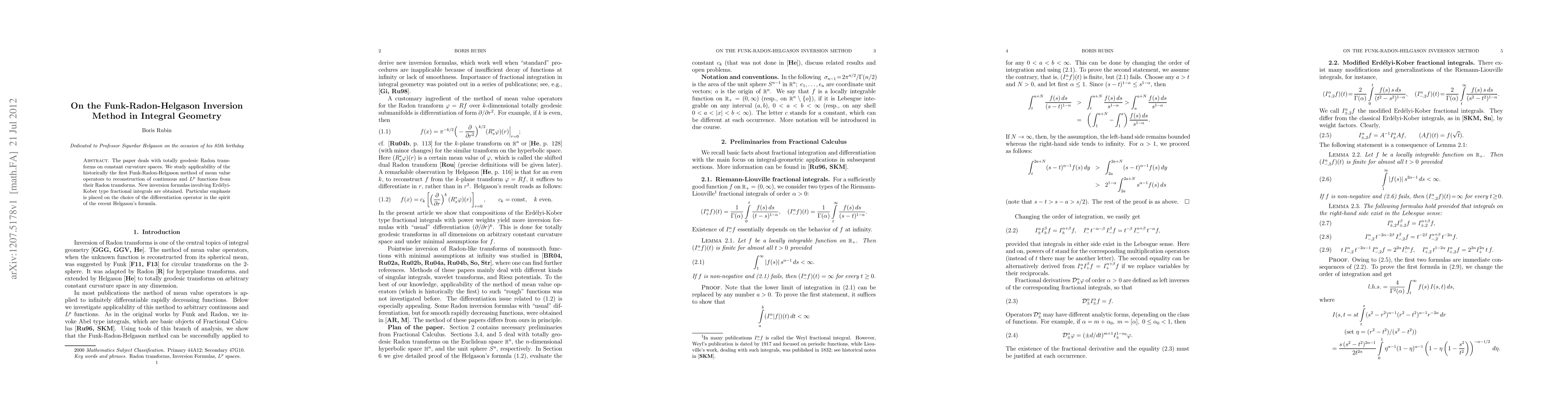This paper investigates the Funk-Radon-Helgason method for reconstructing continuous and $L^p$ functions from their Radon transforms on constant curvature spaces. New inversion formulas utilizing Erd\'elyi-Kober type fractional integrals are developed, with a focus on selecting appropriate differentiation operators inspired by Helgason's recent work.