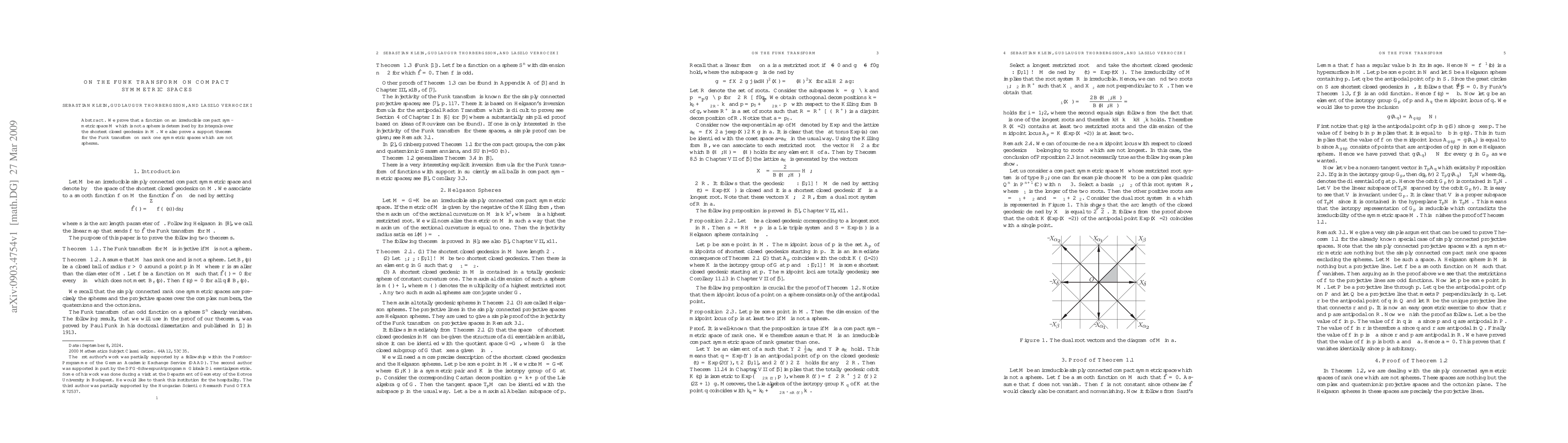 We prove that a function on an irreducible compact symmetric space M, which is not a sphere, is determined by its integrals over the shortest closed geodesics in M. We also prove a support theorem for the Funk transform on rank one symmetric spaces which are not spheres.