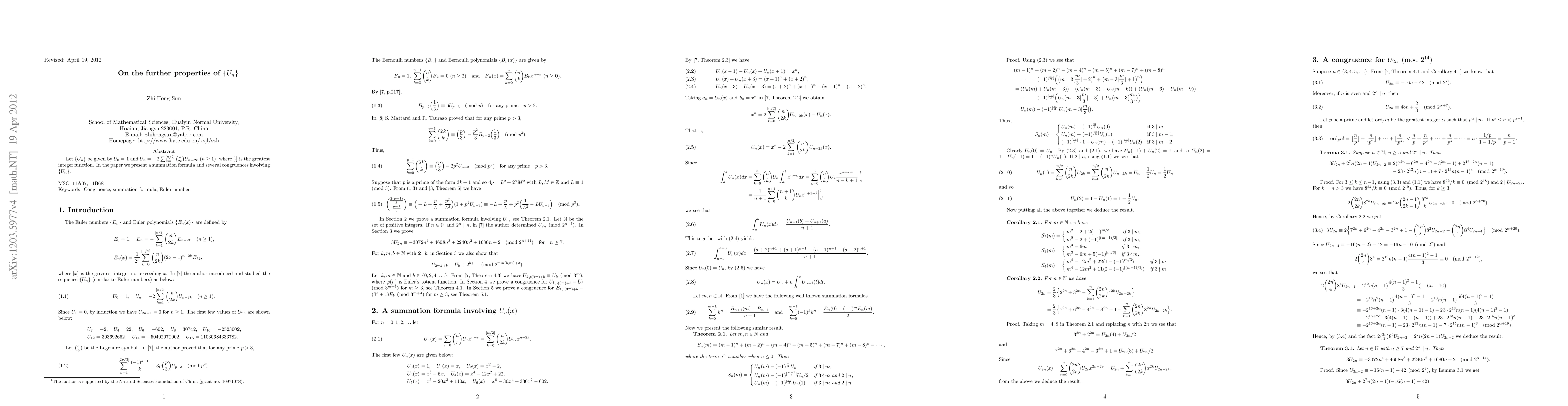Let $\{U_n\}$ be given by $U_0=1$ and $U_n=-2\sum_{k=1}^{[n/2]} \b n{2k}U_{n-2k}\ (n\ge 1)$, where $[\cdot]$ is the greatest integer function. In the paper we present a summation formula and several congruences involving $\{U_n\}$.