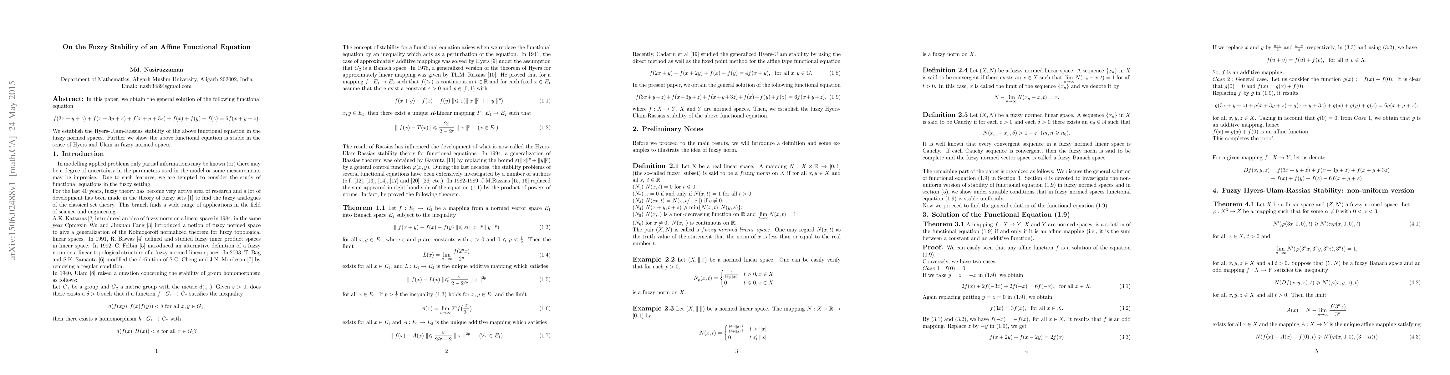 In this paper, we obtain the general solution of the following functional equation f(3x + y + z) + f(x + 3y + z) + f(x + y + 3z) + f(x) + f(y) + f(z) = 6f(x + y + z): We establish the Hyers-Ulam-Rassias stability of the above functional equation in the fuzzy normed spaces. Further we show the above functional equation is stable in the sense of Hyers and Ulam in fuzzy normed spaces.