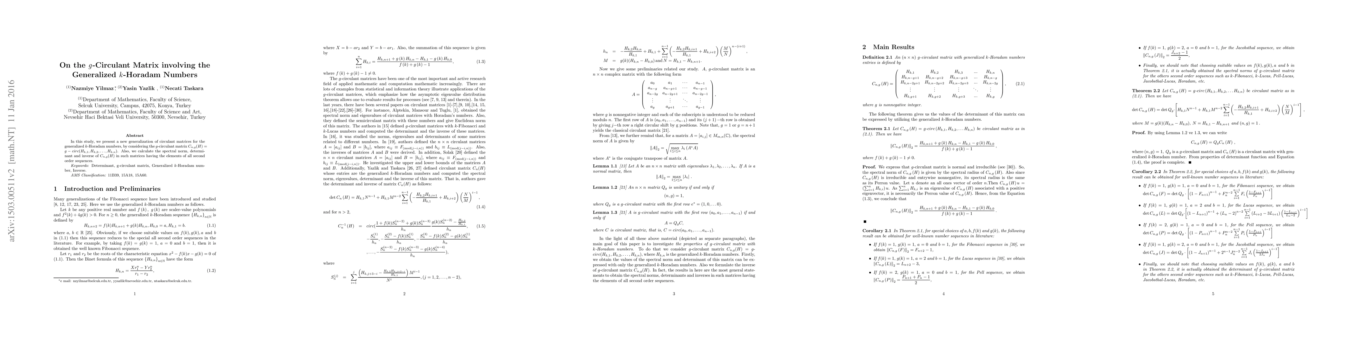 This paper introduces a new $g$-circulant matrix based on generalized $k$-Horadam numbers, denoted as $C_{n,g}(H)$, and computes its spectral norm, determinant, and inverse. The study focuses on the properties of these matrices with elements from second-order sequences.