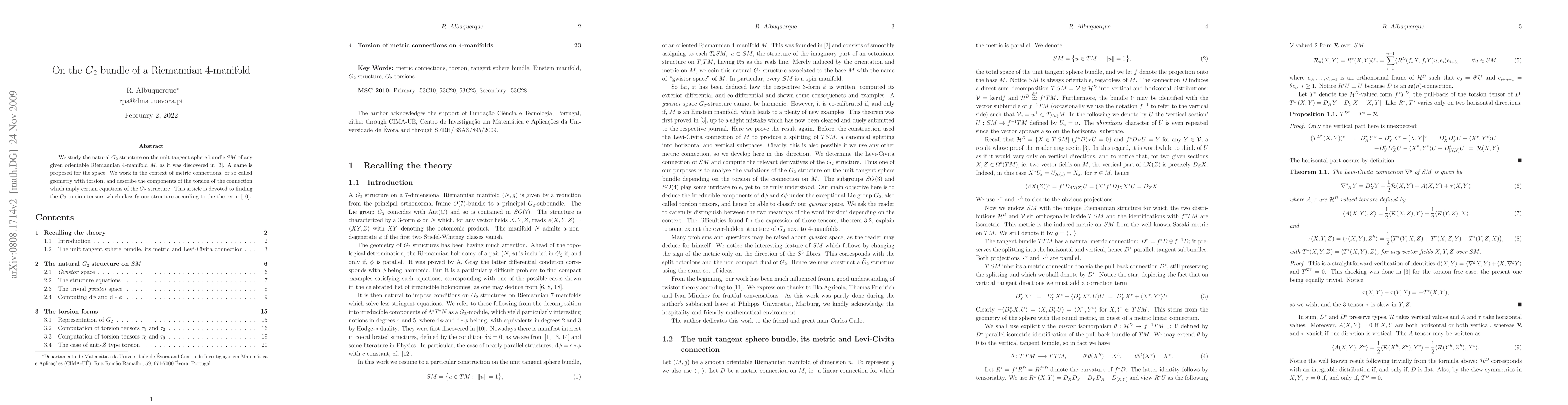 We study the natural G_2 structure on the unit tangent sphere bundle SM of any given orientable Riemannian 4-manifold M, as it was discovered in \cite{AlbSal}. A name is proposed for the space. We work in the context of metric connections, or so called geometry with torsion, and describe the components of the torsion of the connection which imply certain equations of the G_2 structure. This article is devoted to finding the G_2-torsion tensors which classify our structure according to the theory in \cite{FerGray}.