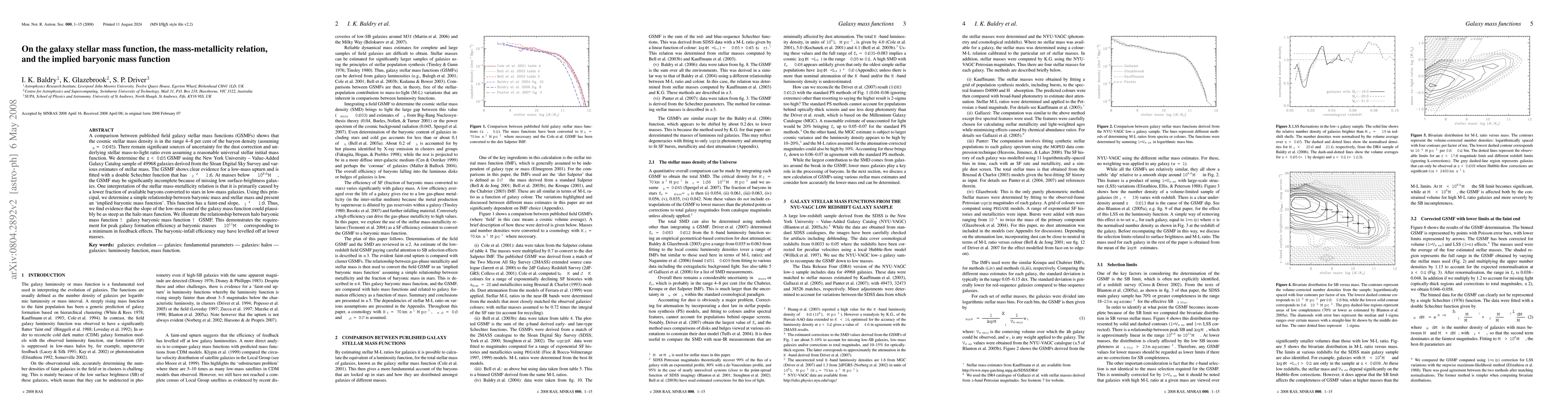 This paper compares galaxy stellar mass functions and finds the cosmic stellar mass density to be 4-8% of baryon density. It presents a z < 0.05 GSMF with a low-mass upturn and a double Schechter function fit, noting potential incompleteness at low masses. It links the stellar mass-metallicity relation to baryonic mass conversion, proposing an "implied baryonic mass function" with a faint-end slope similar to the halo mass function.