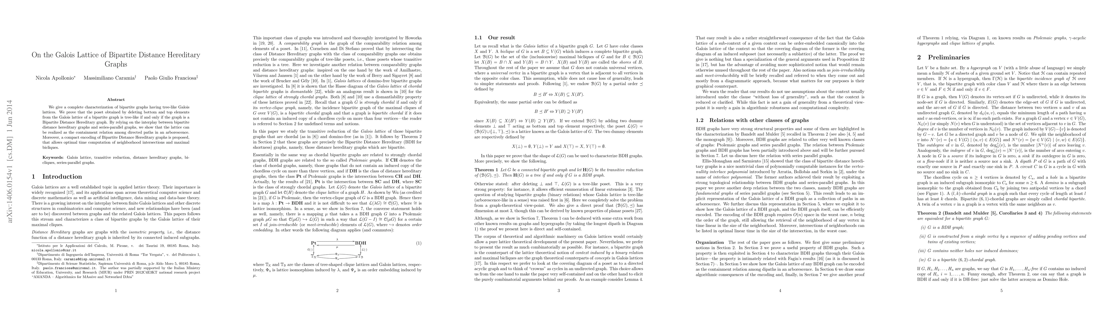 This paper characterizes bipartite graphs with tree-like Galois lattices, proving they are Bipartite Distance Hereditary graphs. It also shows these graphs' lattices can be represented by directed paths in an arborescence, and proposes a compact encoding for efficient computation of neighborhood intersections and maximal bicliques.