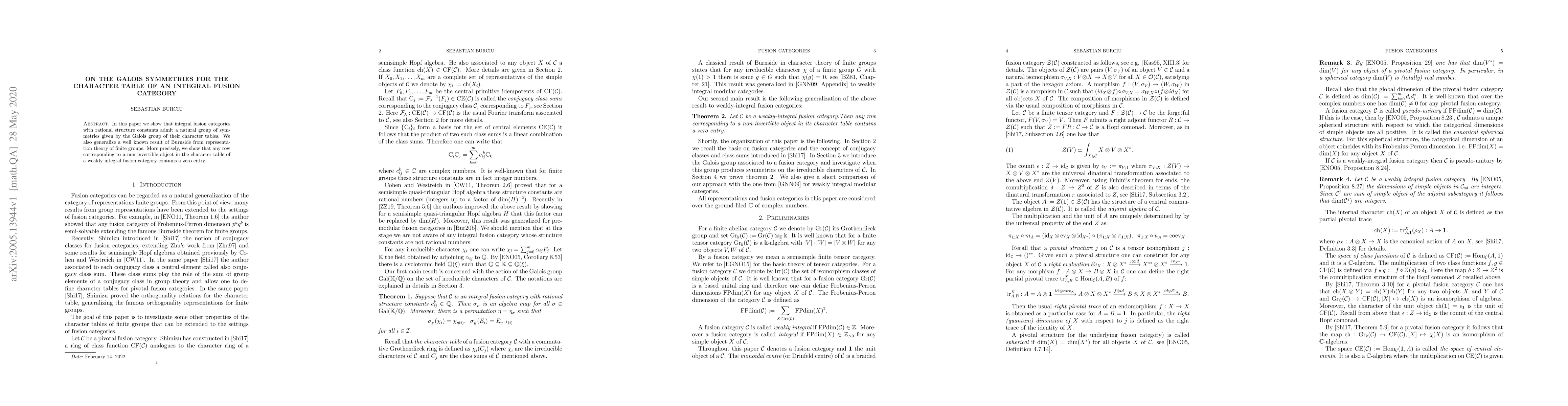 Summary: This paper demonstrates that integral fusion categories with rational structure constants exhibit symmetries via the Galois group of their character tables. It also extends Burnside's theorem to show that rows in the character table for non-invertible objects in weakly integral fusion categories contain zero entries.