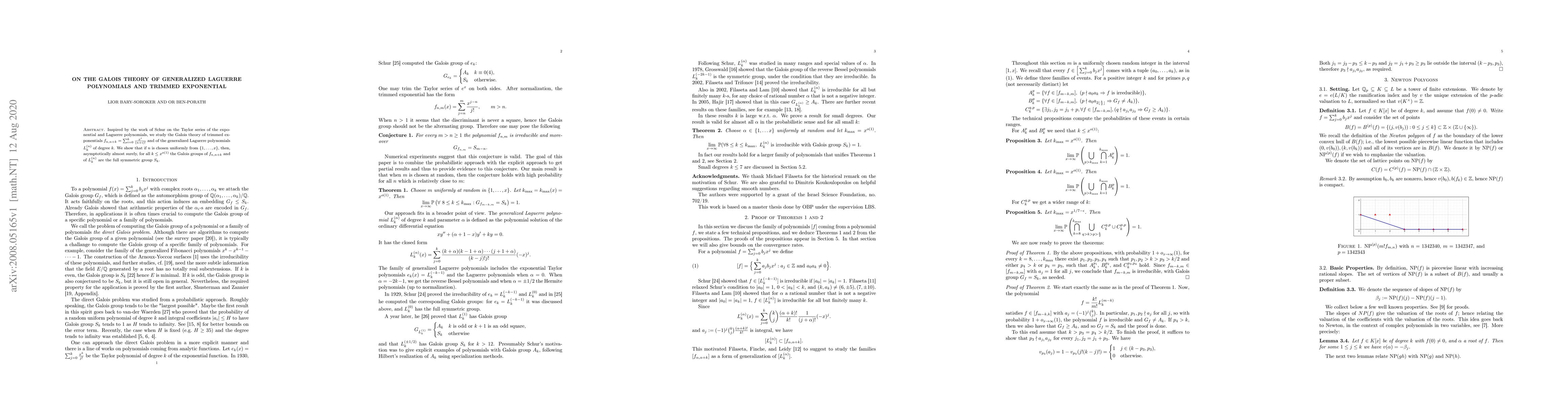 Summary: This paper explores the Galois theory of trimmed exponentials and generalized Laguerre polynomials, demonstrating that for large $x$ and small $k$, the Galois groups of these polynomials are asymptotically almost surely the full symmetric group $S_k$. This extends Schur's work on the Taylor series of exponentials and Laguerre polynomials.