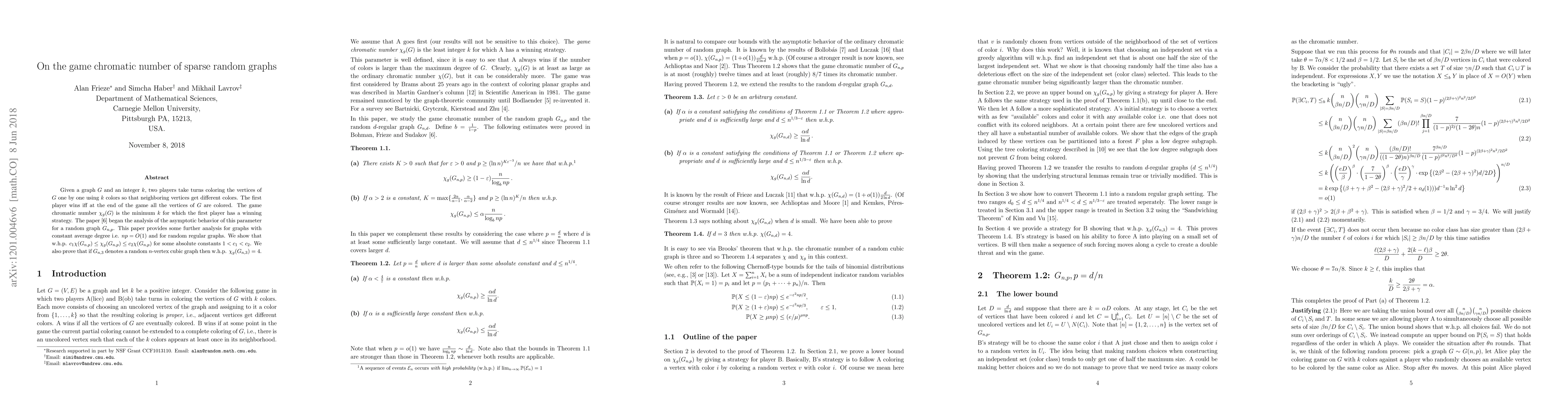 Given a graph G and an integer k, two players take turns coloring the vertices of G one by one using k colors so that neighboring vertices get different colors. The first player wins iff at the end of the game all the vertices of $G$ are colored. The game chromatic number \chi_g(G) is the minimum k for which the first player has a winning strategy. The paper \cite{BFS} began the analysis of the asymptotic behavior of this parameter for a random graph G_{n,p}. This paper provides some further analysis for graphs with constant average degree i.e. np=O(1) and for random regular graphs.
