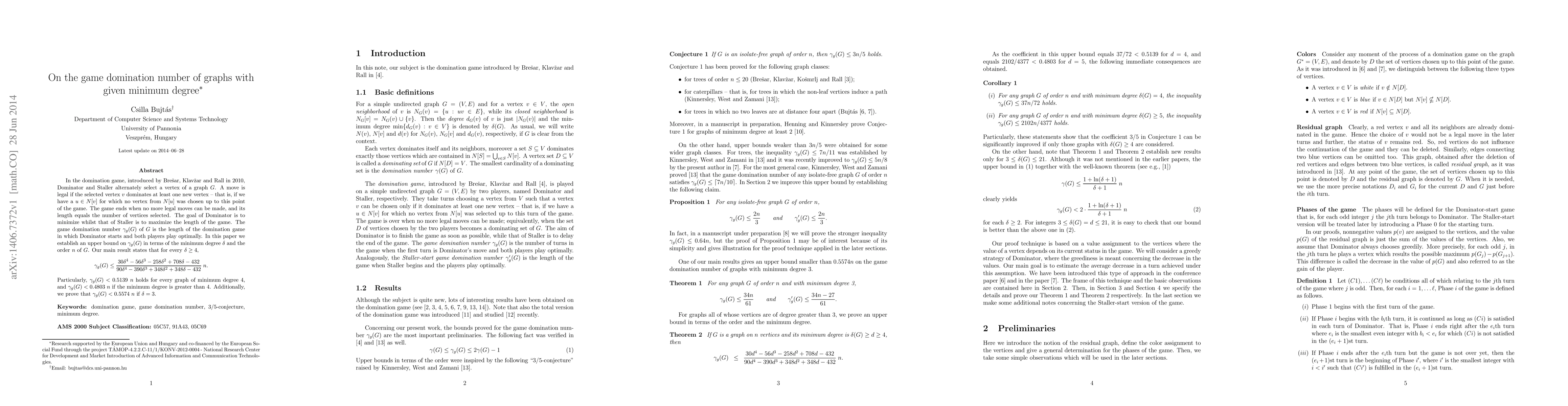 In the domination game, introduced by Bre\v{s}ar, Klav\v{z}ar and Rall in 2010, Dominator and Staller alternately select a vertex of a graph $G$. A move is legal if the selected vertex $v$ dominates at least one new vertex -- that is, if we have a $u\in N[v]$ for which no vertex from $N[u]$ was chosen up to this point of the game. The game ends when no more legal moves can be made, and its length equals the number of vertices selected. The goal of Dominator is to minimize whilst that of Staller is to maximize the length of the game. The game domination number $\gamma_g(G)$ of $G$ is the length of the domination game in which Dominator starts and both players play optimally. In this paper we establish an upper bound on $\gamma_g(G)$ in terms of the minimum degree $\delta$ and the order $n$ of $G$. Our main result states that for every $\delta \ge 4$, $$\gamma_g(G)\le \frac{30\delta^4-56\delta^3-258\delta^2+708\delta-432}{90\delta^4-390\delta^3+348\delta^2+348\delta-432}\; n.$$ Particularly, $\gamma_g(G) < 0.5139\; n$ holds for every graph of minimum degree 4, and $\gamma_g(G)< 0.4803\; n$ if the minimum degree is greater than 4. Additionally, we prove that $\gamma_g(G) < 0.5574\; n$ if $\delta=3$.