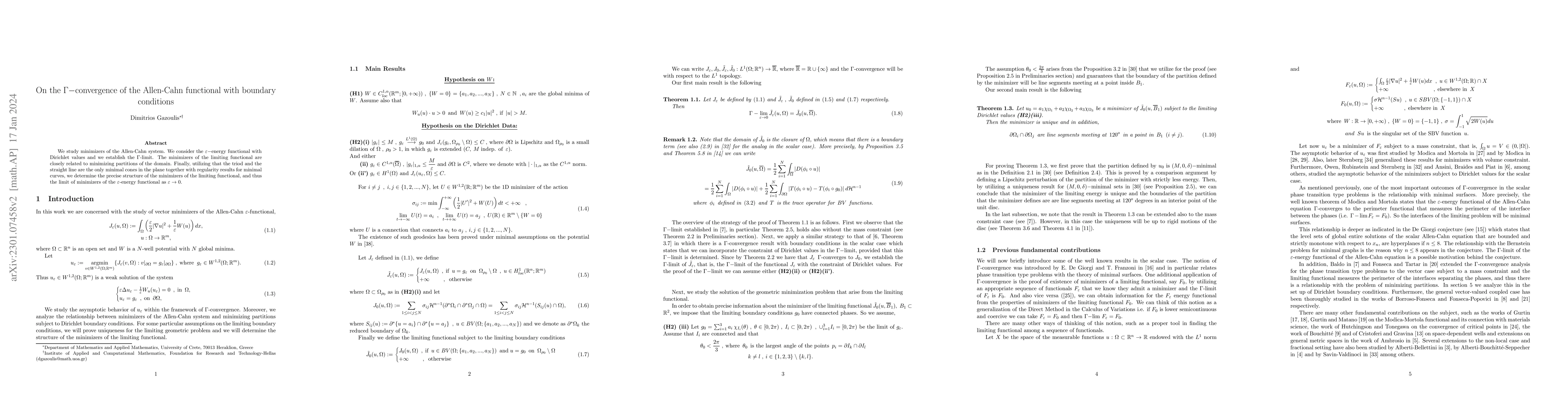 We study minimizers of the Allen-Cahn system. We consider the $ \varepsilon $-energy functional with Dirichlet values and we establish the $ \Gamma $-limit. The minimizers of the limiting functional are closely related to minimizing partitions of the domain. Finally, utilizing that the triod and the straight line are the only minimal cones in the plane together with regularity results for minimal curves, we determine the precise structure of the minimizers of the limiting functional, and thus the limit of minimizers of the $ \varepsilon $-energy functional as $ \varepsilon \rightarrow 0 $.