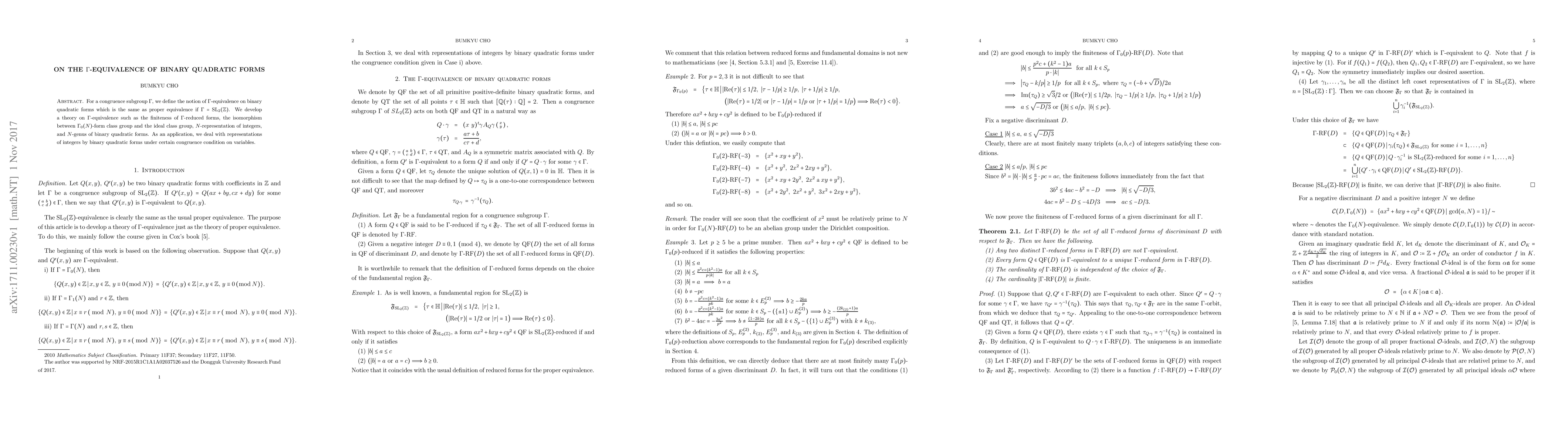 This paper develops a theory of $\Gamma$-equivalence for binary quadratic forms, establishing the finiteness of $\Gamma$-reduced forms and exploring connections to class groups and integer representations. It applies this theory to study representations of integers under congruence conditions.