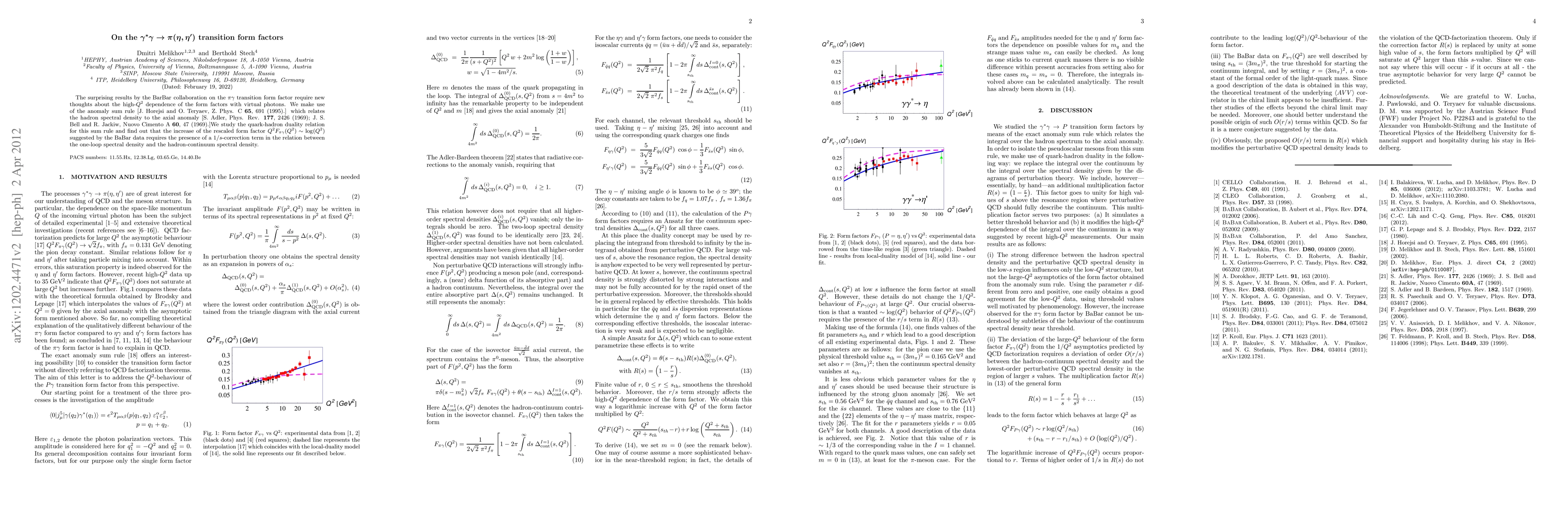 Researchers investigate the $ u gamma$ transition form factor using an anomaly sum rule to explain surprising BaBar data results, suggesting a $1/s$-correction term is needed in spectral density relations.