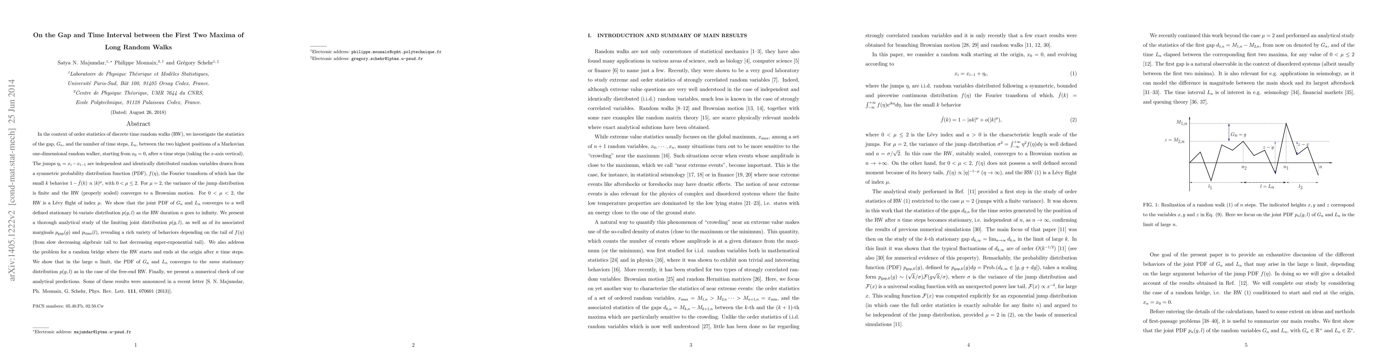 In the context of order statistics of discrete time random walks (RW), we investigate the statistics of the gap, $G_n$, and the number of time steps, $L_n$, between the two highest positions of a Markovian one-dimensional random walker, starting from $x_0 = 0$, after $n$ time steps (taking the $x$-axis vertical). The jumps $\eta_i = x_i - x_{i-1}$ are independent and identically distributed random variables drawn from a symmetric probability distribution function (PDF), $f(\eta)$, the Fourier transform of which has the small $k$ behavior $1 - \hat f(k) \propto |k|^\mu$, with $0 < \mu \leq 2$. For $\mu=2$, the variance of the jump distribution is finite and the RW (properly scaled) converges to a Brownian motion. For $0<\mu<2$, the RW is a L\'evy flight of index $\mu$. We show that the joint PDF of $G_n$ and $L_n$ converges to a well defined stationary bi-variate distribution $p(g,l)$ as the RW duration $n$ goes to infinity. We present a thorough analytical study of the limiting joint distribution $p(g,l)$, as well as of its associated marginals $p_{\rm gap}(g)$ and $p_{\rm time}(l)$, revealing a rich variety of behaviors depending on the tail of $f(\eta)$ (from slow decreasing algebraic tail to fast decreasing super-exponential tail). We also address the problem for a random bridge where the RW starts and ends at the origin after $n$ time steps. We show that in the large $n$ limit, the PDF of $G_n$ and $L_n$ converges to the {\it same} stationary distribution $p(g,l)$ as in the case of the free-end RW. Finally, we present a numerical check of our analytical predictions. Some of these results were announced in a recent letter [S. N. Majumdar, Ph. Mounaix, G. Schehr, Phys. Rev. Lett. {\bf 111}, 070601 (2013)].