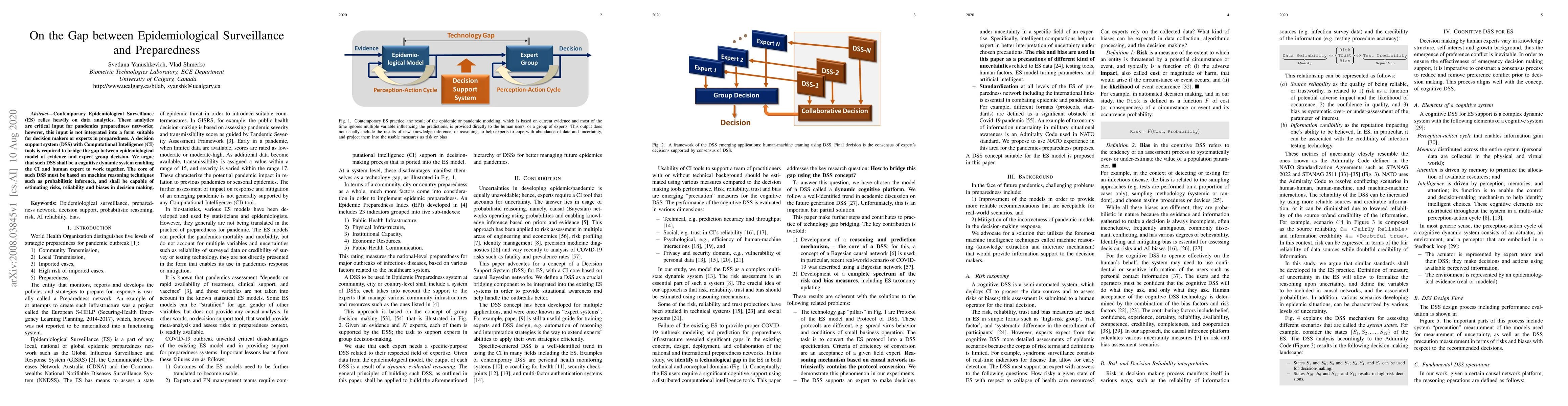Contemporary Epidemiological Surveillance (ES) relies heavily on data analytics. These analytics are critical input for pandemics preparedness networks; however, this input is not integrated into a form suitable for decision makers or experts in preparedness. A decision support system (DSS) with Computational Intelligence (CI) tools is required to bridge the gap between epidemiological model of evidence and expert group decision. We argue that such DSS shall be a cognitive dynamic system enabling the CI and human expert to work together. The core of such DSS must be based on machine reasoning techniques such as probabilistic inference, and shall be capable of estimating risks, reliability and biases in decision making.