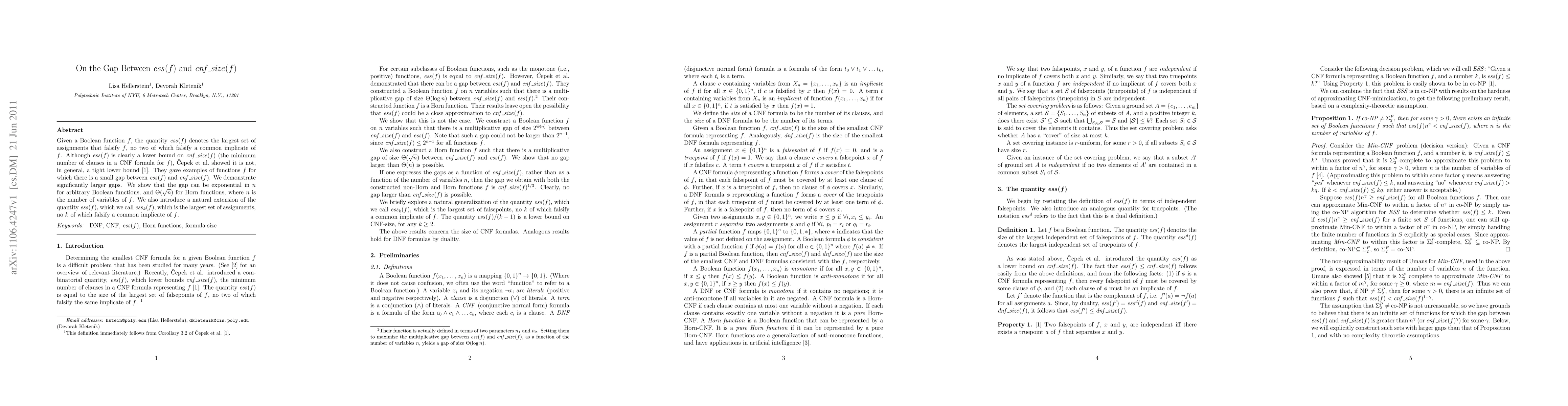 Given a Boolean function f, the quantity ess(f) denotes the largest set of assignments that falsify f, no two of which falsify a common implicate of f. Although ess(f)$ is clearly a lower bound on cnf_size(f) (the minimum number of clauses in a CNF formula for f), Cepek et al. showed that it is not, in general, a tight lower bound. They gave examples of functions f for which there is a small gap between ess(f) and cnf_size(f). We demonstrate significantly larger gaps. We show that the gap can be exponential in n for arbitrary Boolean functions, and Theta(sqrt{n}) for Horn functions, where n is the number of variables of f. We also introduce a natural extension of the quantity ess(f), which we call ess_k(f), which is the largest set of assignments, no k of which falsify a common implicate of f.