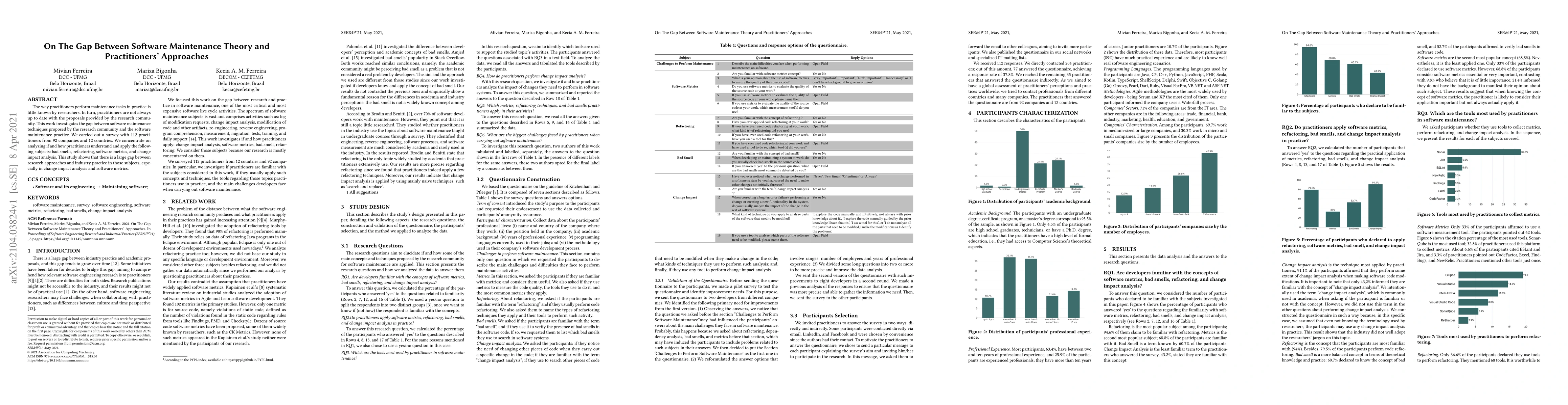 The way practitioners perform maintenance tasks in practice is little known by researchers. In turn, practitioners are not always up to date with the proposals provided by the research community. This work investigates the gap between software maintenance techniques proposed by the research community and the software maintenance practice. We carried out a survey with 112 practitioners from 92 companies and 12 countries. We concentrate on analyzing if and how practitioners understand and apply the following subjects: bad smells, refactoring, software metrics, and change impact analysis. This study shows that there is a large gap between research approaches and industry practice in those subjects, especially in change impact analysis and software metrics.