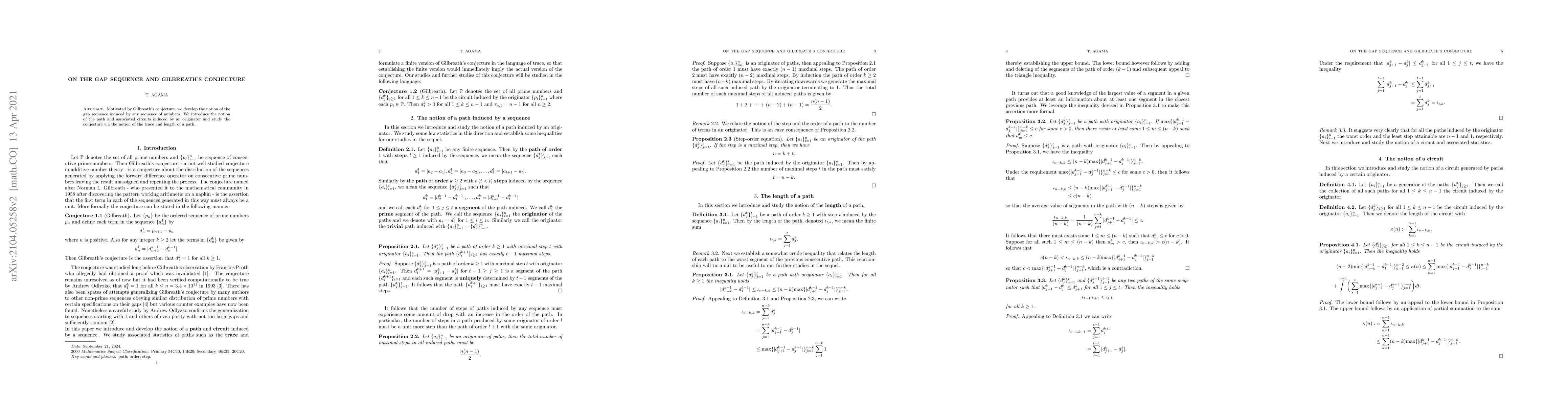 Motivated by Gilbreath's conjecture, we develop the notion of the gap sequence induced by any sequence of numbers. We introduce the notion of the path and associated circuits induced by an originator and study the conjecture via the notion of the trace and length of a path.